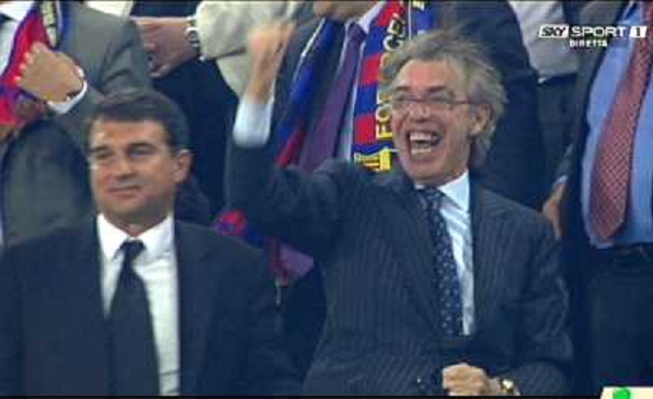 28/04/2010 Champions League BARCELLONA-INTER OBBLIGATORIO CITARE LA FONTE TELEVISIVA MASSIMO MORATTI-A FINE GARA ESULTA E ABBRAC ...