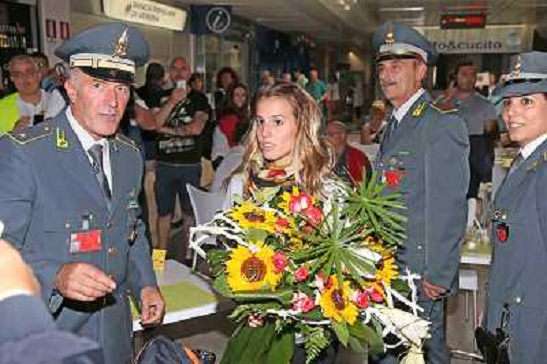 25/08/2014 Altri 25-08-14 ARRIVO TANIA CAGNOTTO ALL'AEROPORTO DI VERONA VIENE ACCOLTA DAL COMANDANTE DELLA GDF CON FR ...
