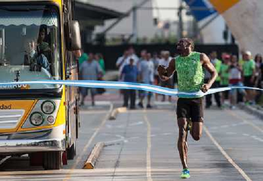 15/12/2013 Altri ITALY ONLY - Il primatista giamaicano Usain Bolt taglia il traguardo battendo in velocita' un autobu ...