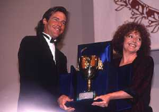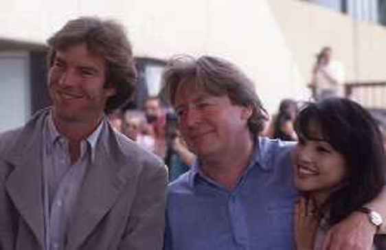 22/12/2023 Personaggi DENNIS QUAID CON TOMLYN TOMITA E ALAN PARKER A CANNES NELL'ANNO 1990