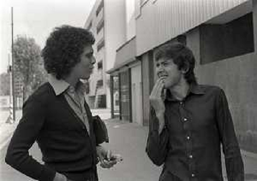03/09/2022 Personaggi GIANNI MORANDI CON CHRISTIAN FUORI DALLA SEDE RAI DI MILANO NELL'ANNO 1975