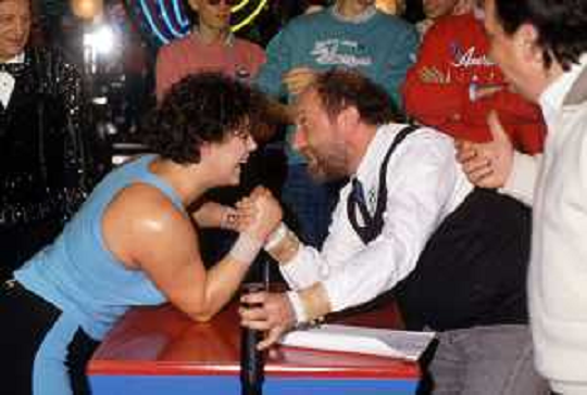 16/07/2022 Personaggi ENRICO BERUSCHI CON MARISTELLA AVANZINI CAMPIONESSA MONDIALE DI 'BRACCIO DI FERRO'