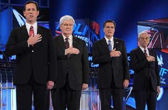 27/01/2012 Avvenimenti ITALY ONLY - Jacksonville: Candidati presidenziali repubblicani durante l'inno nazionale prima del d ...