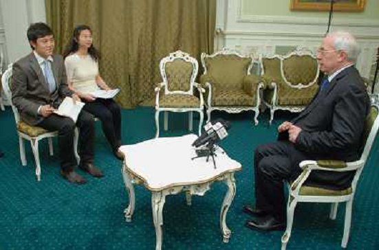 13/04/2011 Avvenimenti KIEV, Il primo ministro ucraino Mikola Azarov (R) riceve intervista di News Agency e CCTV della Cina ...