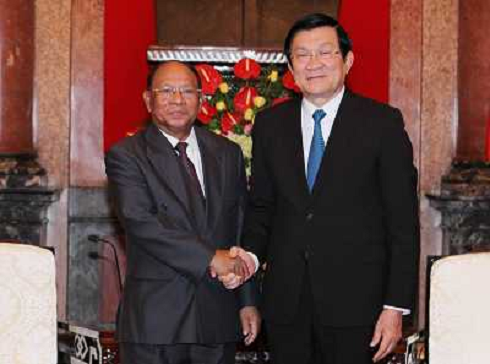 05/01/2014 Personaggi ONLY ITALY-HANOI, Jan. 4, 2014 () -- Vietnamese President Truong Tan Sang (R) shakes hands with visi ...