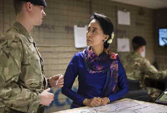 28/10/2013 Personaggi ITALY ONLY - La Leader Birmana Aung San Suu Kyi con un ufficiale di formazione in una simulazione di ...