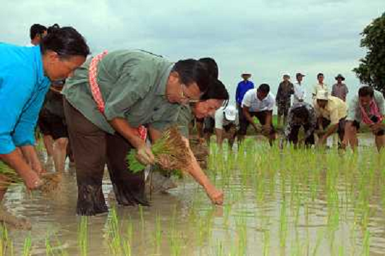 03/08/2013 Personaggi ONLY ITALY-PHNOM PENH, Aug. 2, 2013 () -- Cambodian Prime Minister Hun Sen (2nd L) plants rice seedl ...