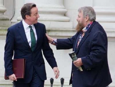 26/04/2013 Personaggi ITALY ONLY - British Prime Minister David Cameron talks to Brian Blessed in Downing Street, London