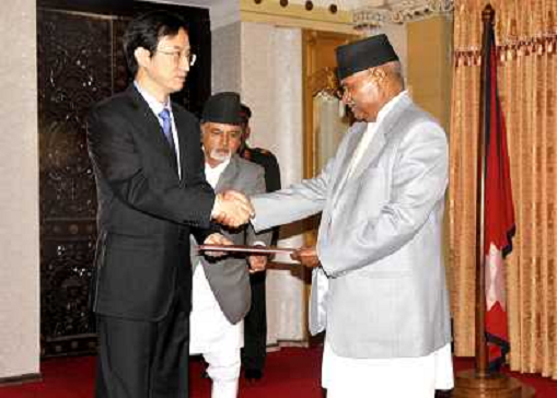 12/03/2013 Personaggi ITALY ONLY - Il presidente Nepalese Ram Baran Yadav con il nuovo ambasciatore cinese in Nepal Wu Chu ...