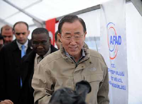 08/12/2012 Personaggi ITALY ONLY - Il Segretario generale dell'ONU Ban Ki-moon dopo aver visitato il campo profughi nella ...