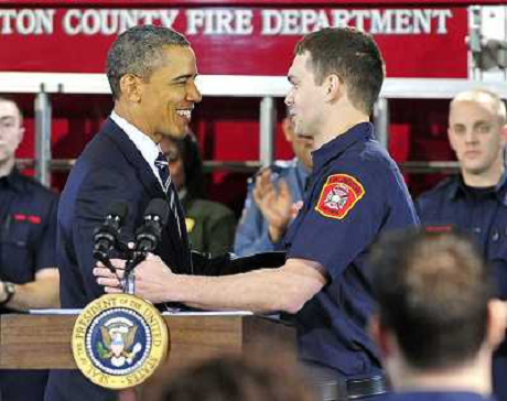 06/02/2012 Personaggi ONLY ITALY-United States President Barack Obama makes remarks on the economy at Fire Station #5 in A ...