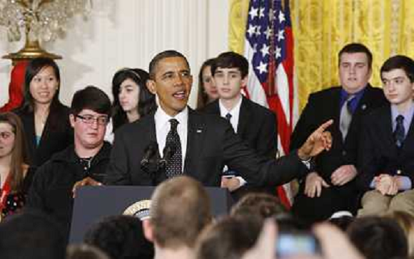 08/02/2012 Personaggi ITALY ONLY - USA: Il presidente americano Barack Obama parla durante la fiera della scienza alla Ca ...