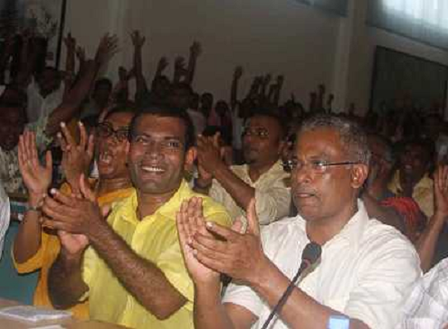 09/02/2012 Personaggi ITALY ONLY: MALE' - L'EX PRESIDENTE DELLE MALDIVE MOHAMED NASHEED ( camicia bianca), DIMISSIONARIO D ...