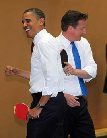 26/05/2011 Personaggi ITALY ONLY - Londra: Il Presidente americano Barack Obama gioca a tennis tavolo con il primo ministr ...