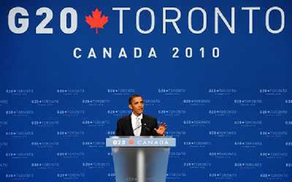 28/06/2010 Personaggi ITALY ONLY - TORONTO: Presidente degli Stati Uniti Barack Obama saluta i giornalisti nel corso di u ...