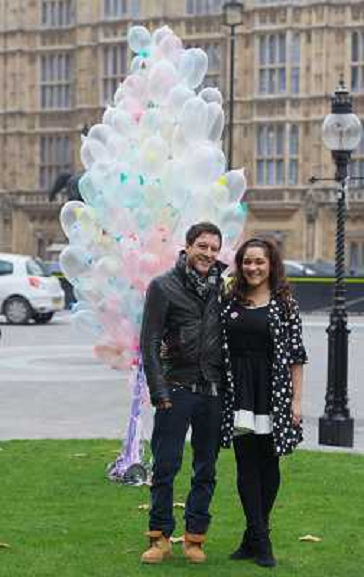 18/11/2011 Altri ITALY ONLY - Inghilterra: Matt Cardle e Shereece con un mazzo di palloncini a forma di preservativi ...