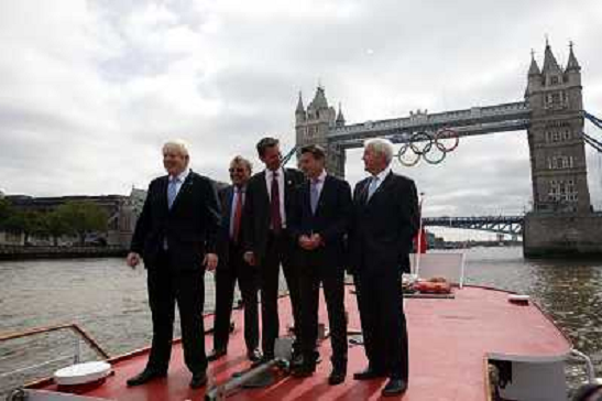28/06/2012 Altri ITALY ONLY - IL SINDACO DI LONDRA Boris Johnson davanti al Tower Bridge Olympic Rings