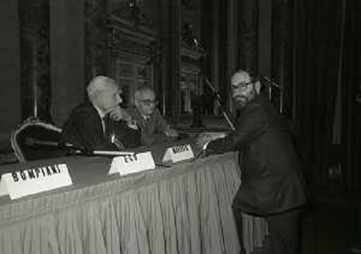 12/03/2021 Giornalisti ALBERTO MORAVIA NELL'ANNO 1984 AL CIRCOLO DELLA STAMPA DI MILANO CON GIULIANO GRAMIGNA UMBERTO ECO ...