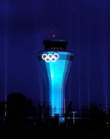 24/04/2012 Olimpiadi ITALY ONLY - I Cinque anelli olimpici illuminati posizionati su entrambi i lati della nuova Torre di ...