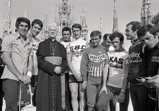 02/05/2020 Ciclismo 1975 MILANO PIAZZA DUOMO IL CARDINALE GIOVANNI COLOMBO BENEDICE I CICLISTI DEL GIRO D'ITALIA