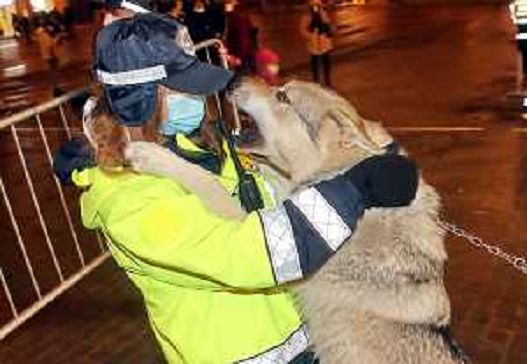 08/12/2020 Cronaca 08-12-2020 IMOLA PIAZZA MATTEOTTI ABBRACCIO TRA UNA VOLONTARIA E UN LUPO CECOSLOVACCO