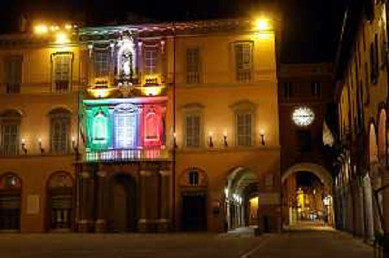 24/04/2020 Cronaca IMOLA 24 04 2020 CORONAVIRUS PIAZZA MATTEOTTI LA FACCIATA DEL MUNICIPIO ILLUMINATA CON TRICOLORE