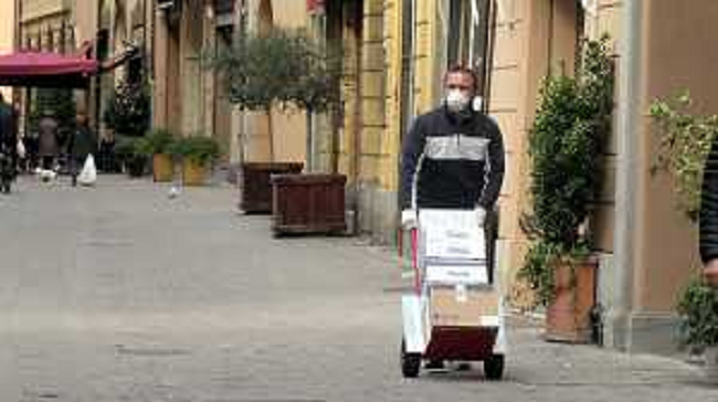 09/03/2020 Cronaca IMOLA 09 03 2020 EMERGENZA CORONAVIRUS OPERAIO IN CENTRO IMOLA CON MASCHERINA