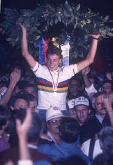 06/02/2025 Ciclismo MAURIZIO FONDRIEST FESTEGGIA A CLES LA VITTORIA DI CAMPIONE DEL MONDO NELL'ANNO 1988