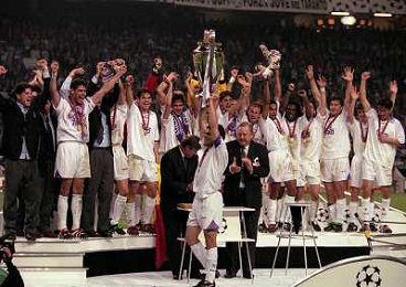 AMSTERDAM 20-05-1998 FINALE DI CHAMPIONS LEAGUE REAL MADRID JUVENTUS NELLA FOTO I GIOCATORI DEL REAL MADRID PREMIATI CON LA COPPA DEI CAMPIONI AG ALDO LIVERANI SAS
