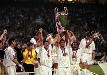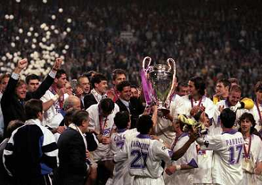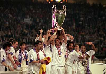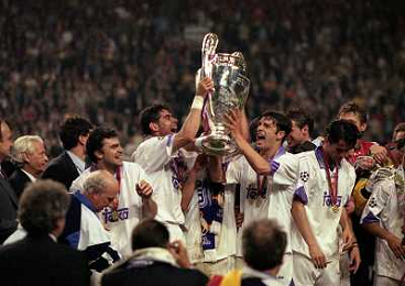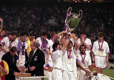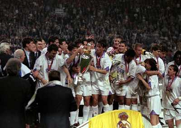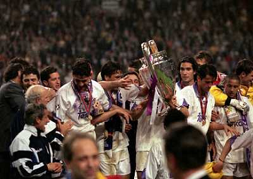 AMSTERDAM 20-05-1998 FINALE DI CHAMPIONS LEAGUE REAL MADRID JUVENTUS NELLA FOTO I GIOCATORI DEL REAL MADRID CON LA COPPA DEI CAMPIONI E CHRISTIAN PANUCCI AG ALDO LIVERANI SAS