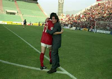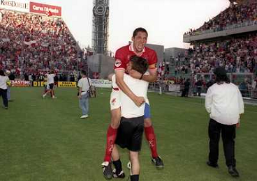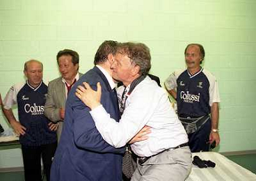 21-06-1998 REGGIO EMILIA SPAREGGIO PROMOZIONE PER LA SERIE A NELLA FOTO LUCIANO GAUCCI PRESIDENTE PERUGIA CALCIO ABBRACCI ILARIO CASTAGNER CHE SI E' INFORTUNATO ALLA GAMBA CADENDO IN CAMPO DOPO I FESTEGGIAMENTI AG ALDO LIVERANI SAS