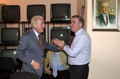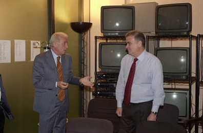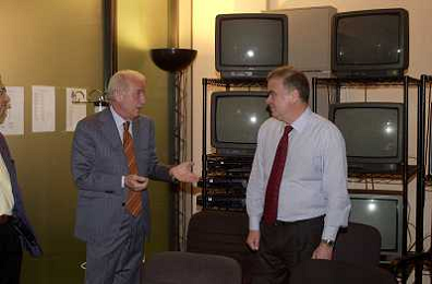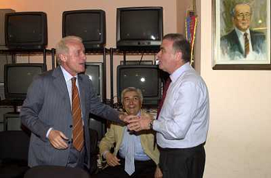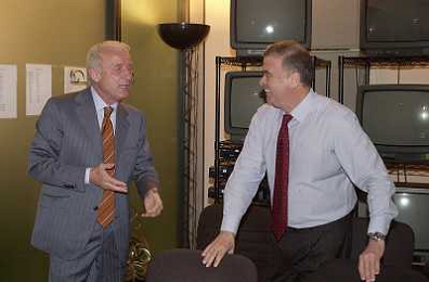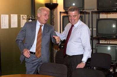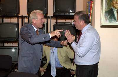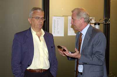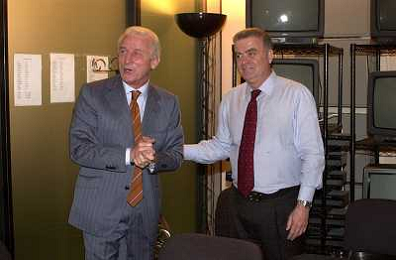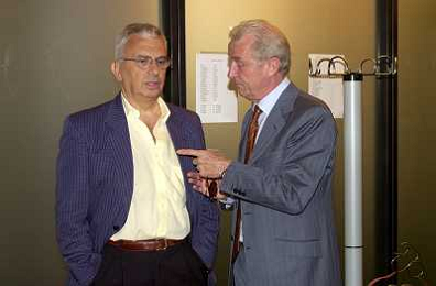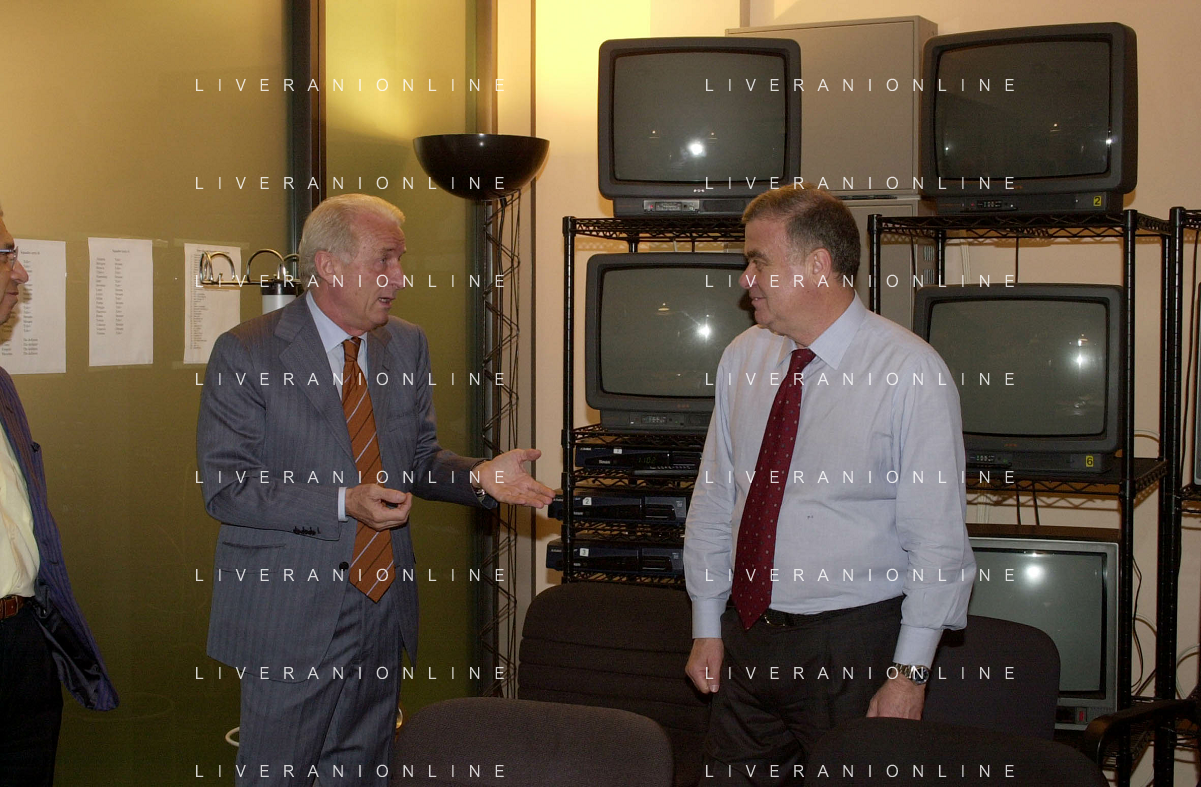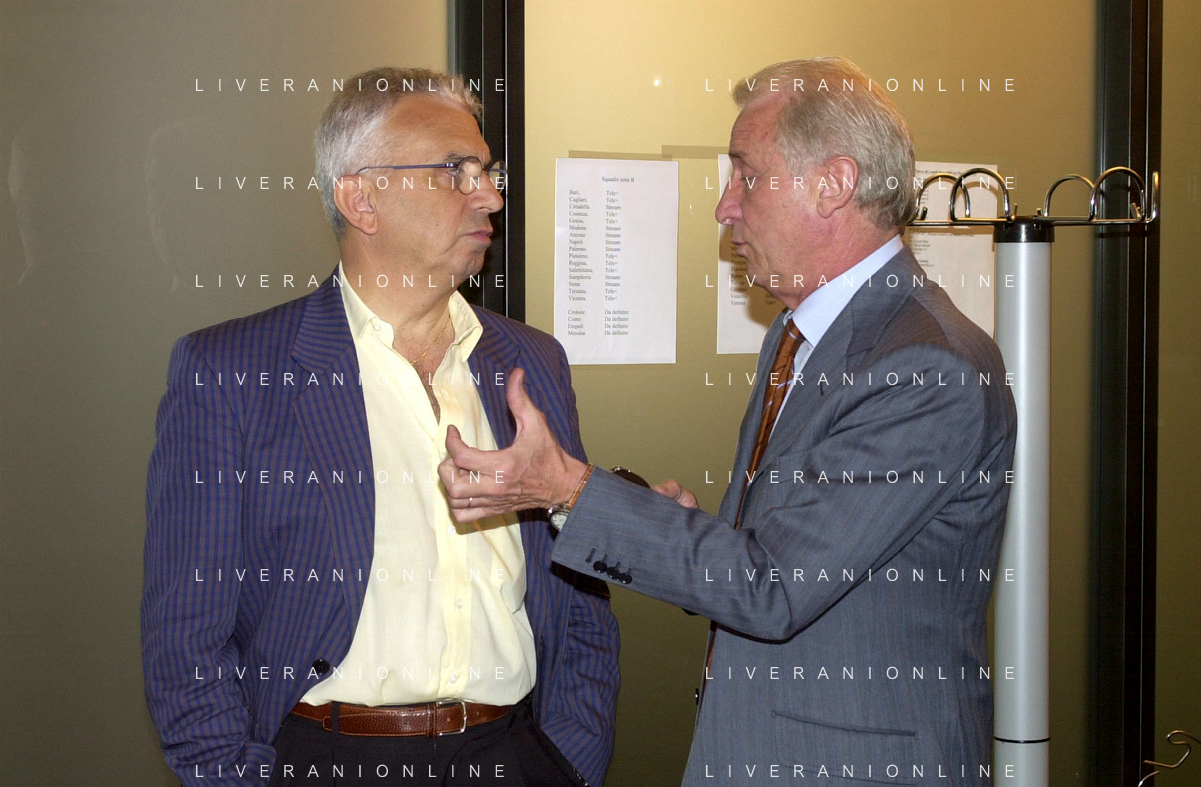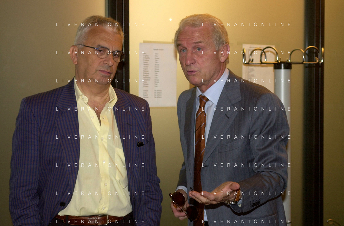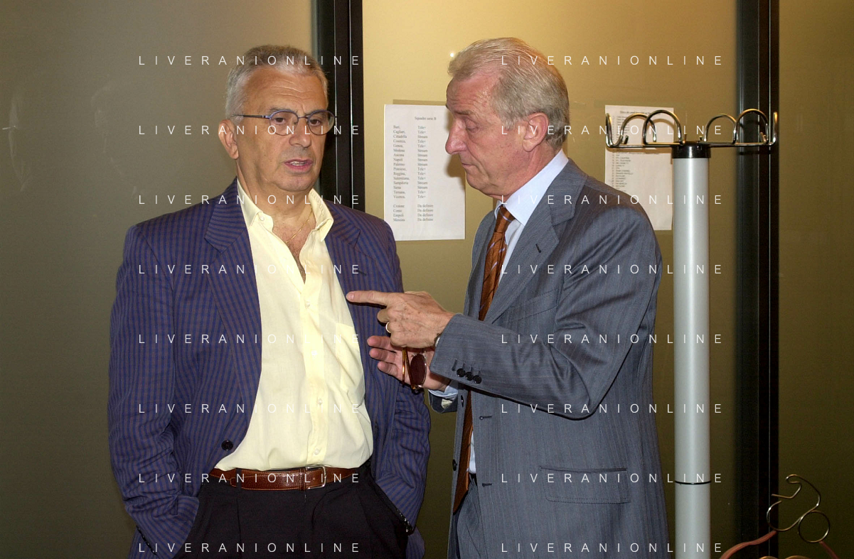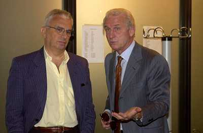 MILANO,09-07-02 DFP/ FOTO GIORGIO RAVEZZANI GIOVANNI TRAPATTONI IN GAZZETTA DELLO SPORT NELLA FOTO GIOVANNI TRAPATTONI CON PIETRO CALABRESE AG ALDO LIVERANI SAS