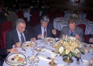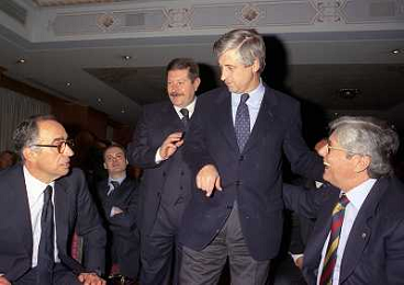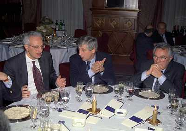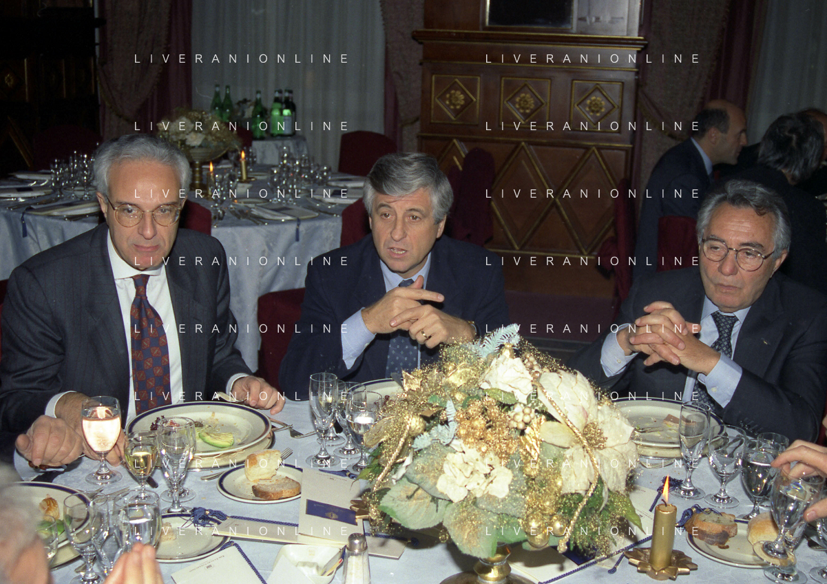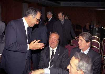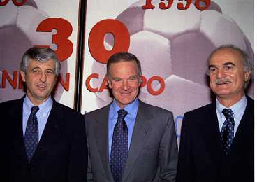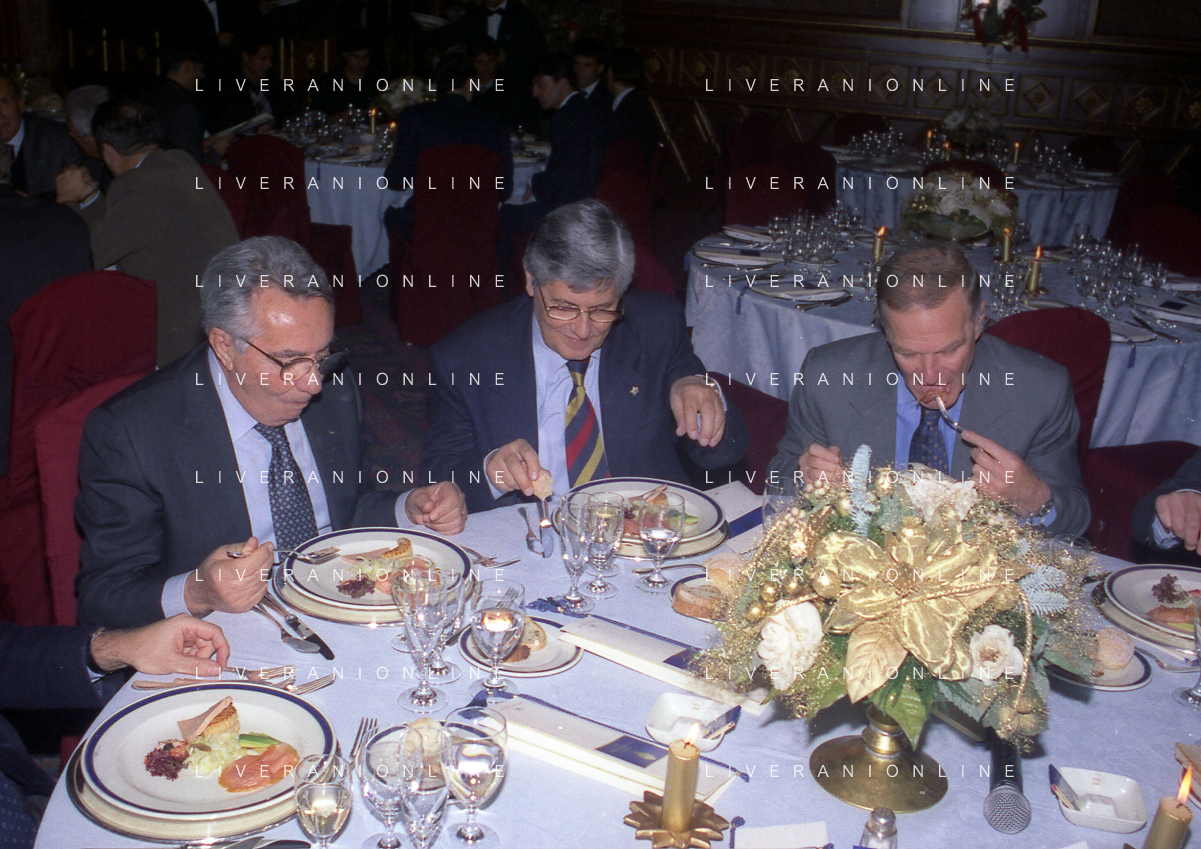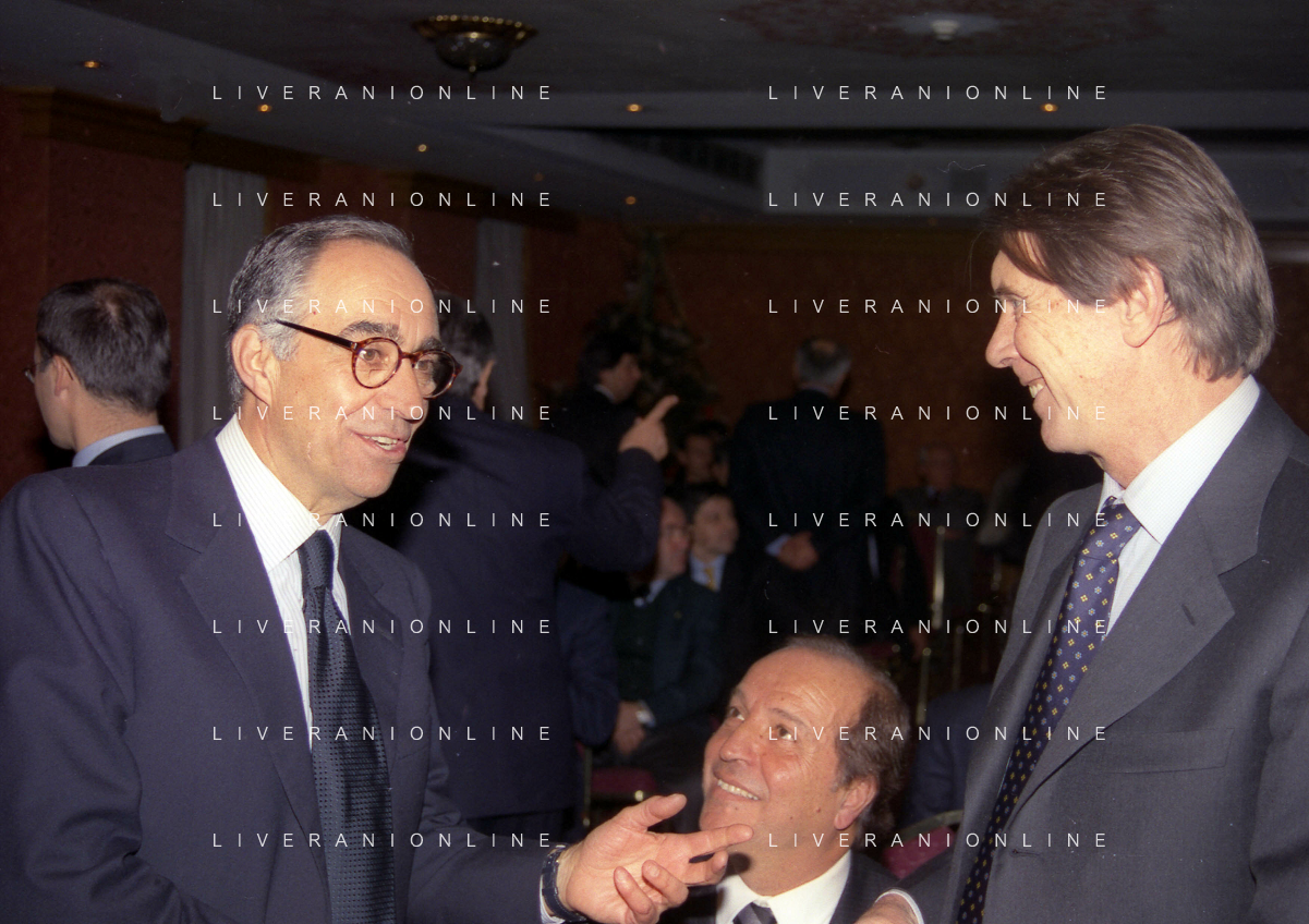 MILANO 14-12-1998 FESTA DI GALA DELL'ASSOCIAZIONE CALCIATORI PER I 30 ANNI DI ATTIVITA NELLA FOTO FRANCO CARRARO CON GIANNI RIVERA E LUCIANI NIZZOLA AG ALDO LIVERANI SAS