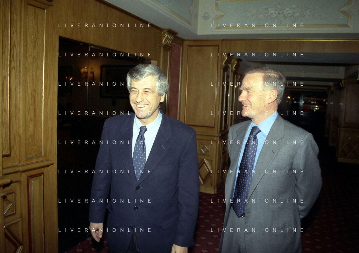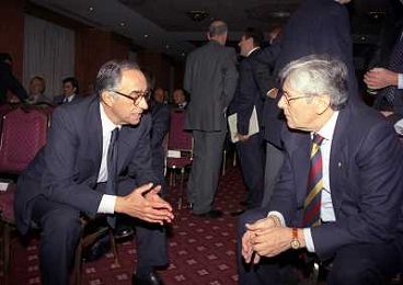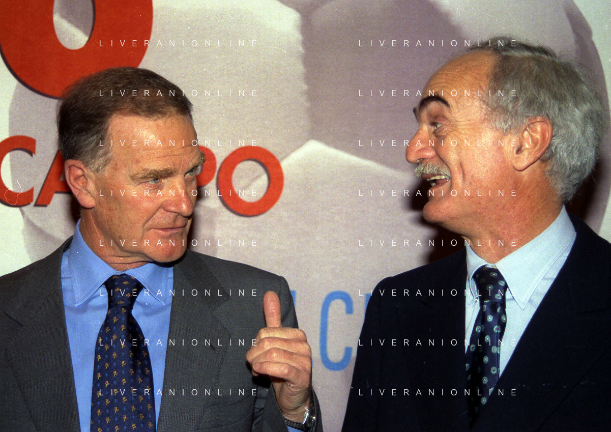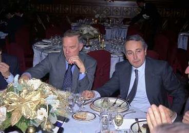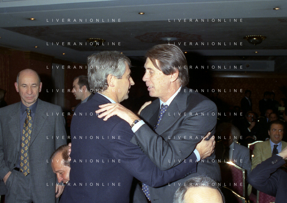 MILANO 14-12-1998 FESTA DI GALA DELL'ASSOCIAZIONE CALCIATORI PER I 30 ANNI DI ATTIVITA NELLA FOTO FRANCO CARRARO CON LUCIANO NIZZOLA AG ALDO LIVERANI SAS