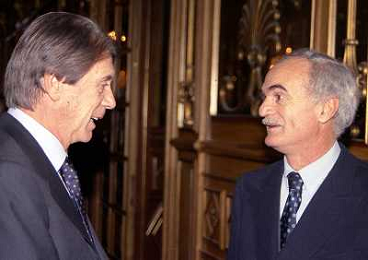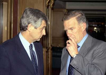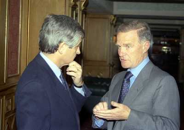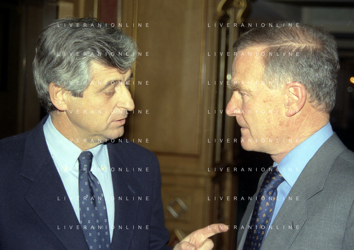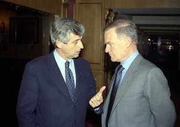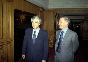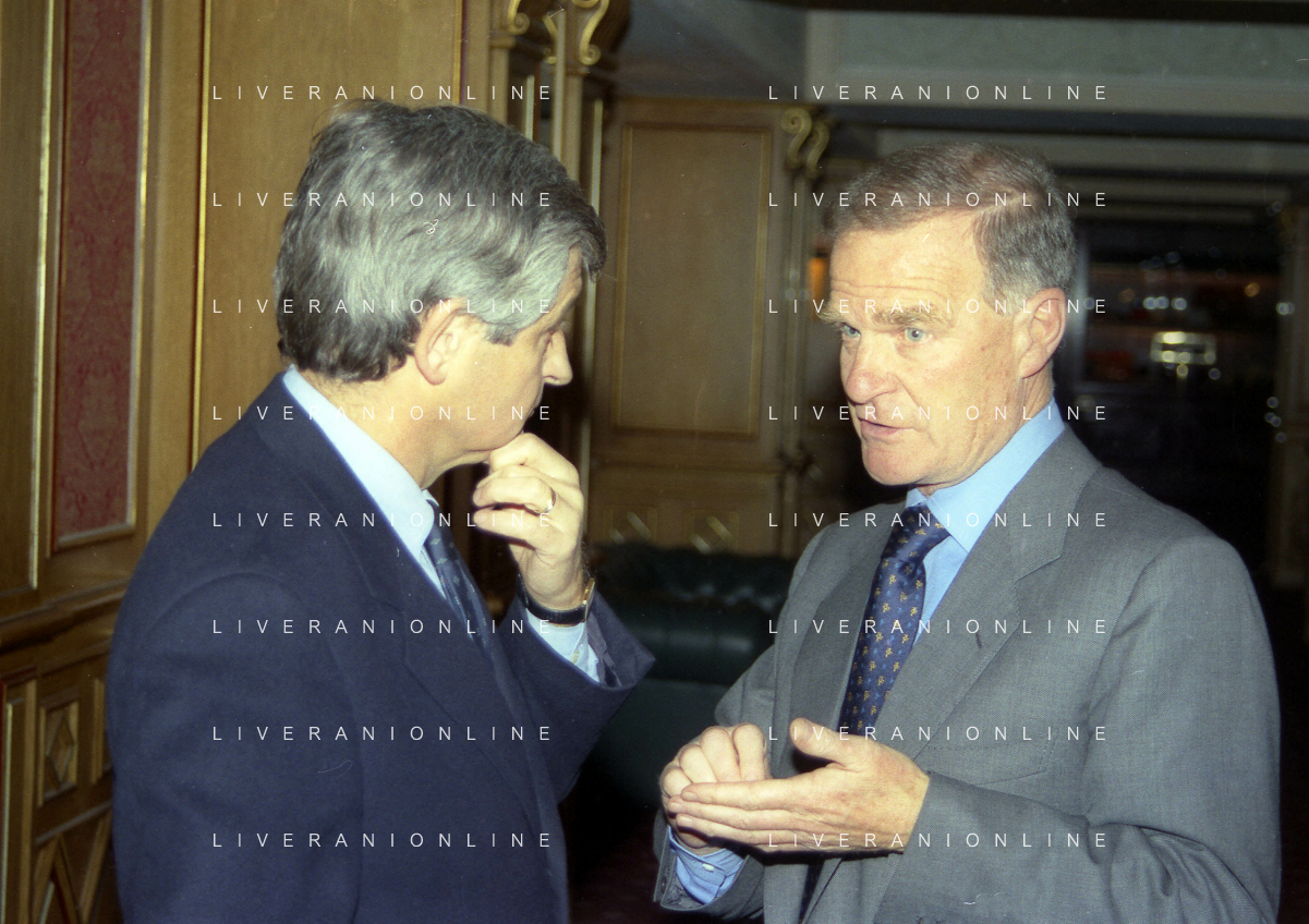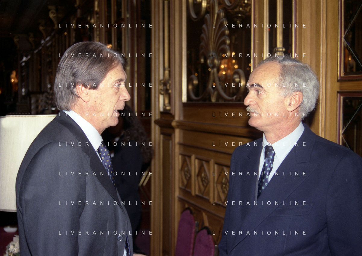 MILANO 14-12-1998 FESTA DI GALA DELL'ASSOCIAZIONE CALCIATORI PER I 30 ANNI DI ATTIVITA NELLA FOTO FRANCO CARRARO CON LUCIANO NIZZOLA AG ALDO LIVERANI SAS