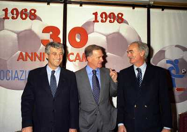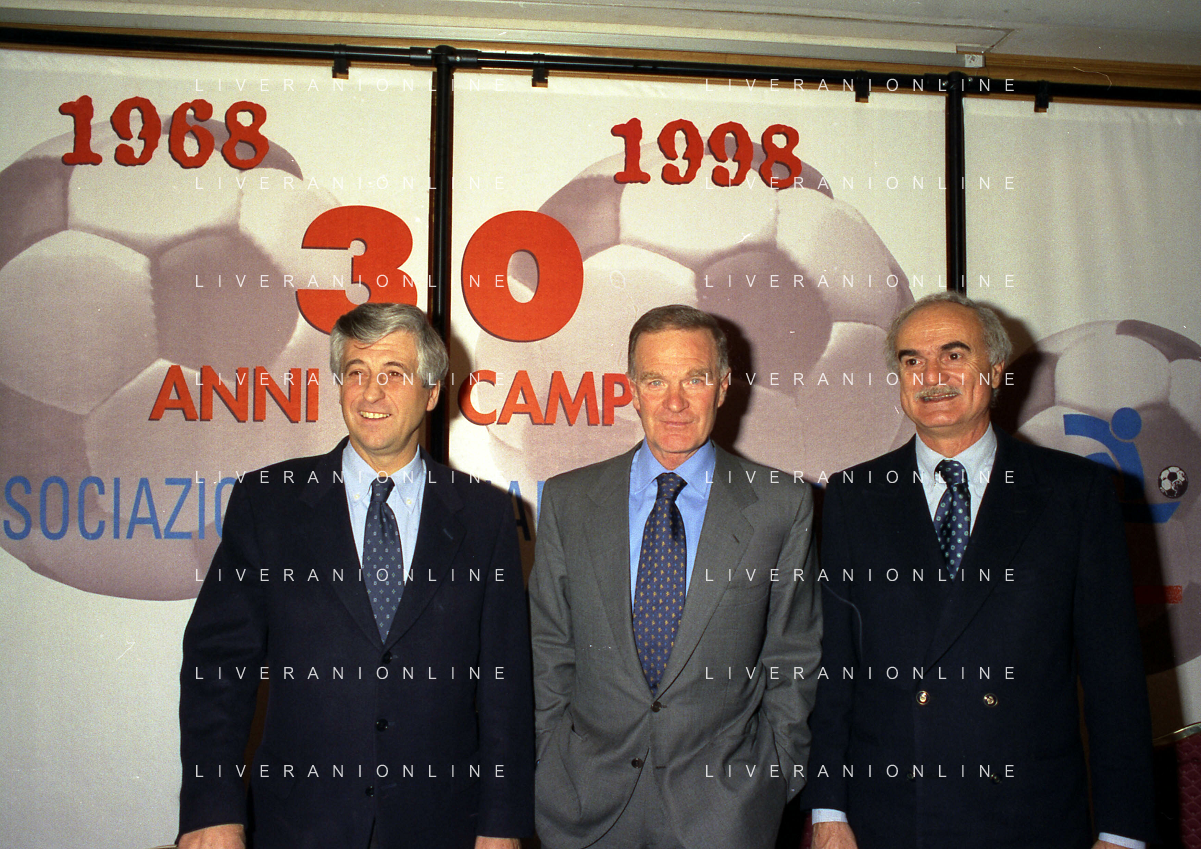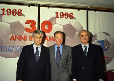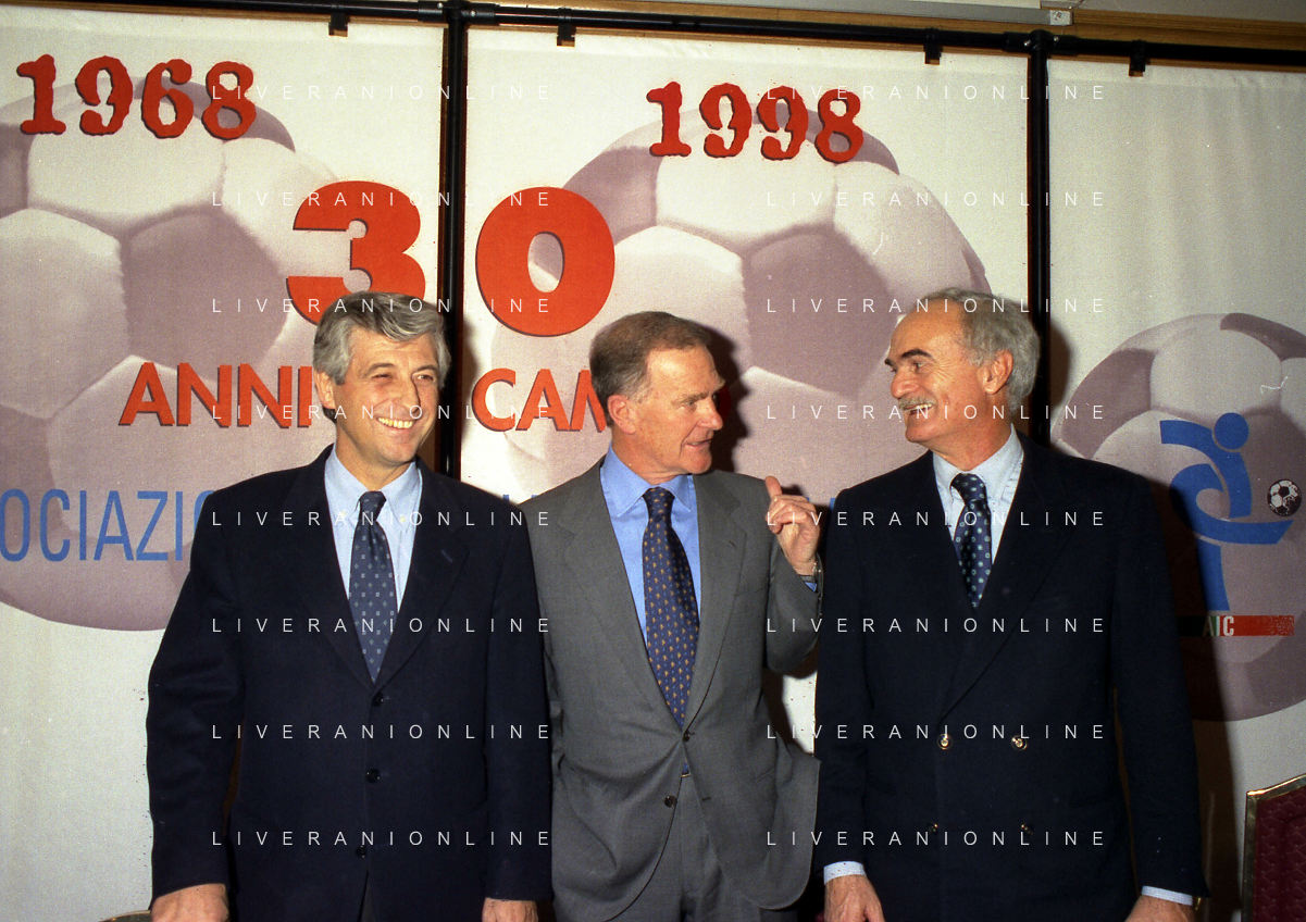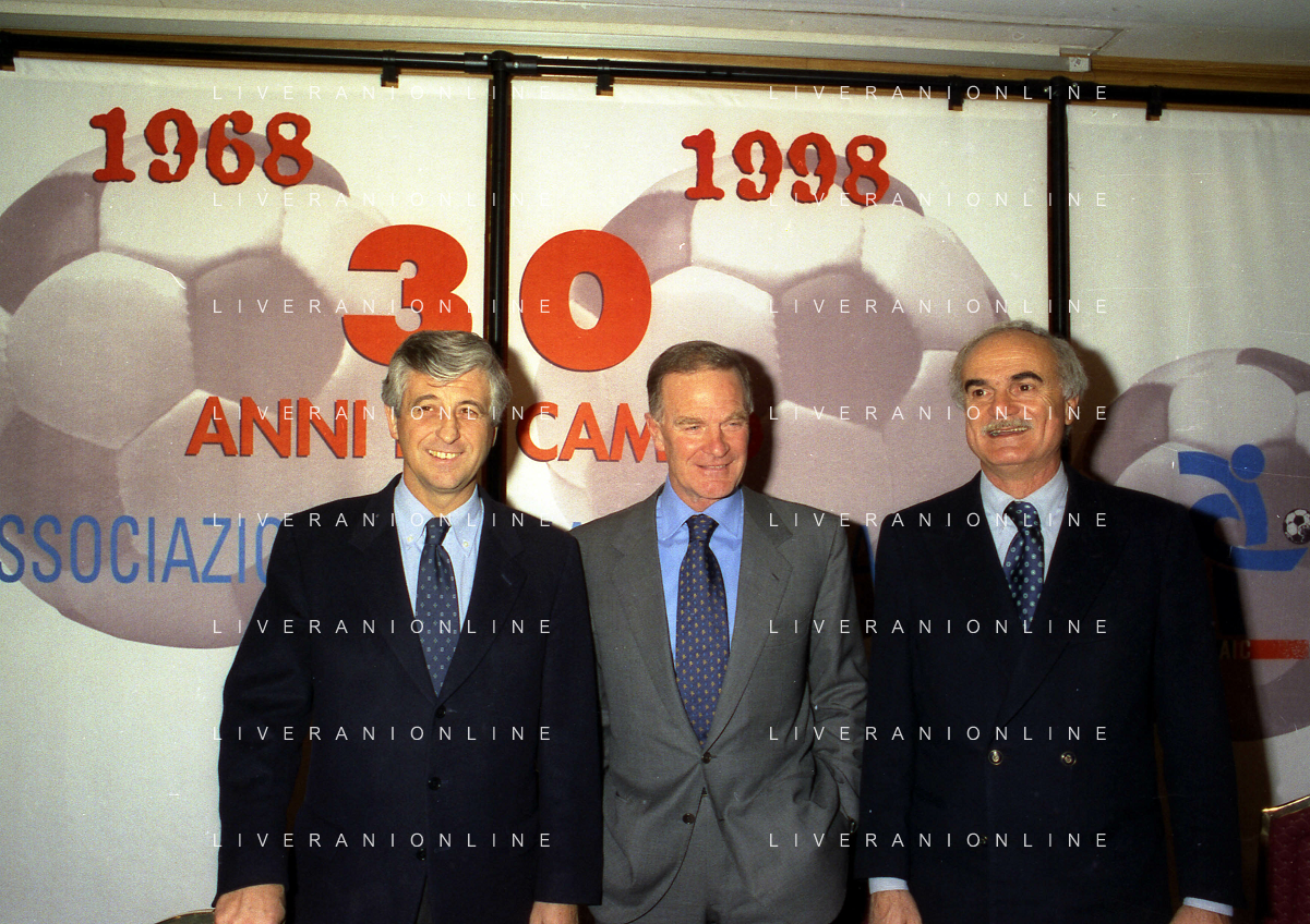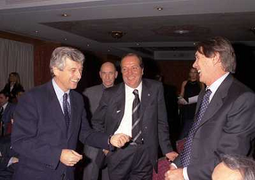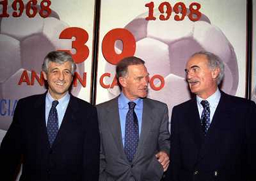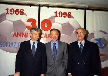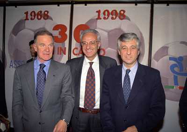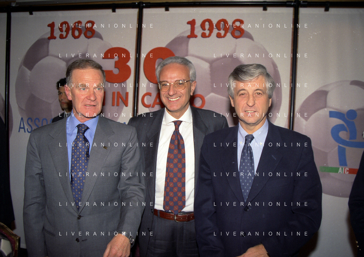MILANO 14-12-1998 FESTA DI GALA DELL'ASSOCIAZIONE CALCIATORI PER I 30 ANNI DI ATTIVITA NELLA FOTO FRANCO CARRARO CON GIANNI RIVERA E LUCIANO NIZZOLA AG ALDO LIVERANI SAS