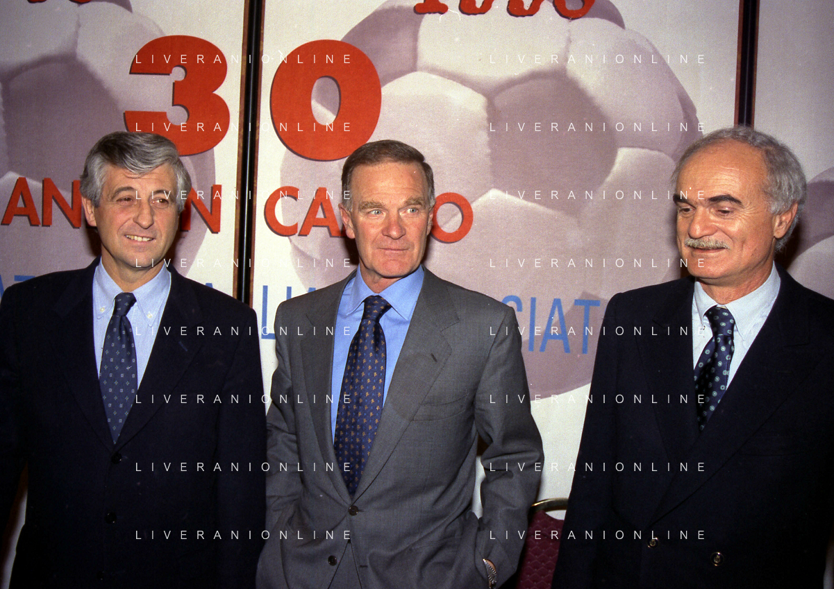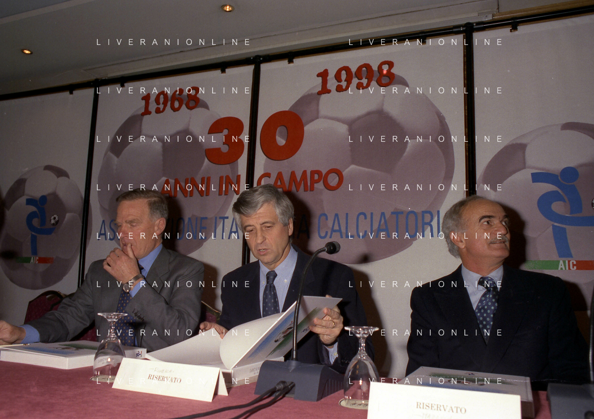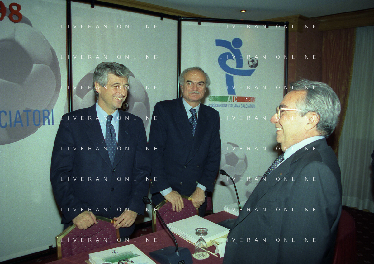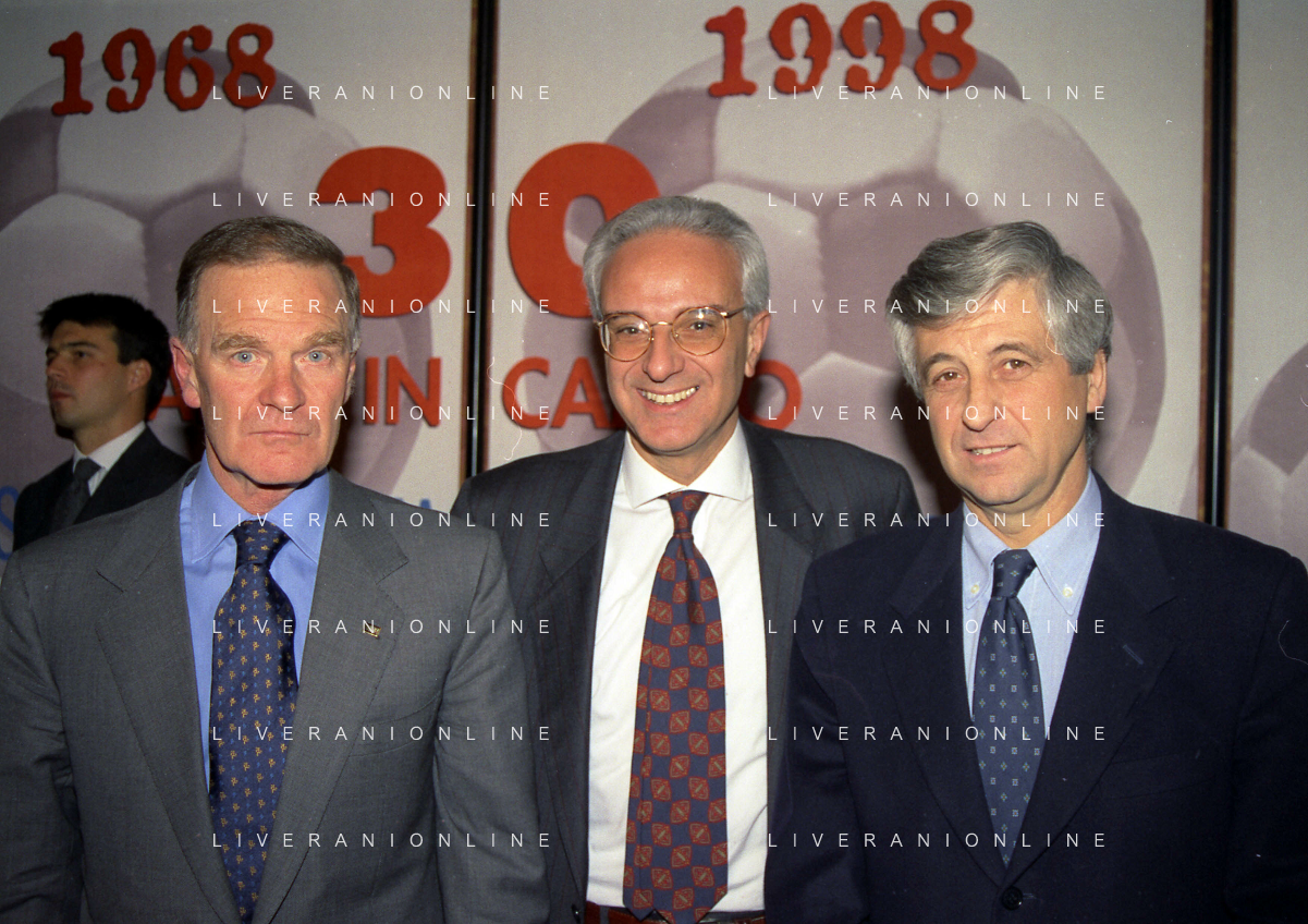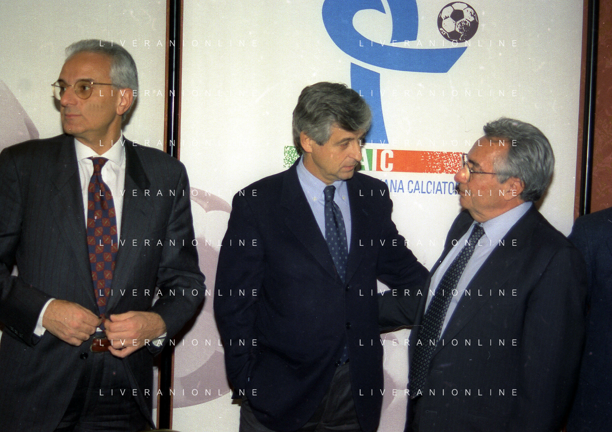 MILANO 14-12-1998 FESTA DI GALA DELL'ASSOCIAZIONE CALCIATORI PER I 30 ANNI DI ATTIVITA NELLA FOTO FRANCO CARRARO CON GIANNI RIVERA E LUCIANO NIZZOLA AG ALDO LIVERANI SAS