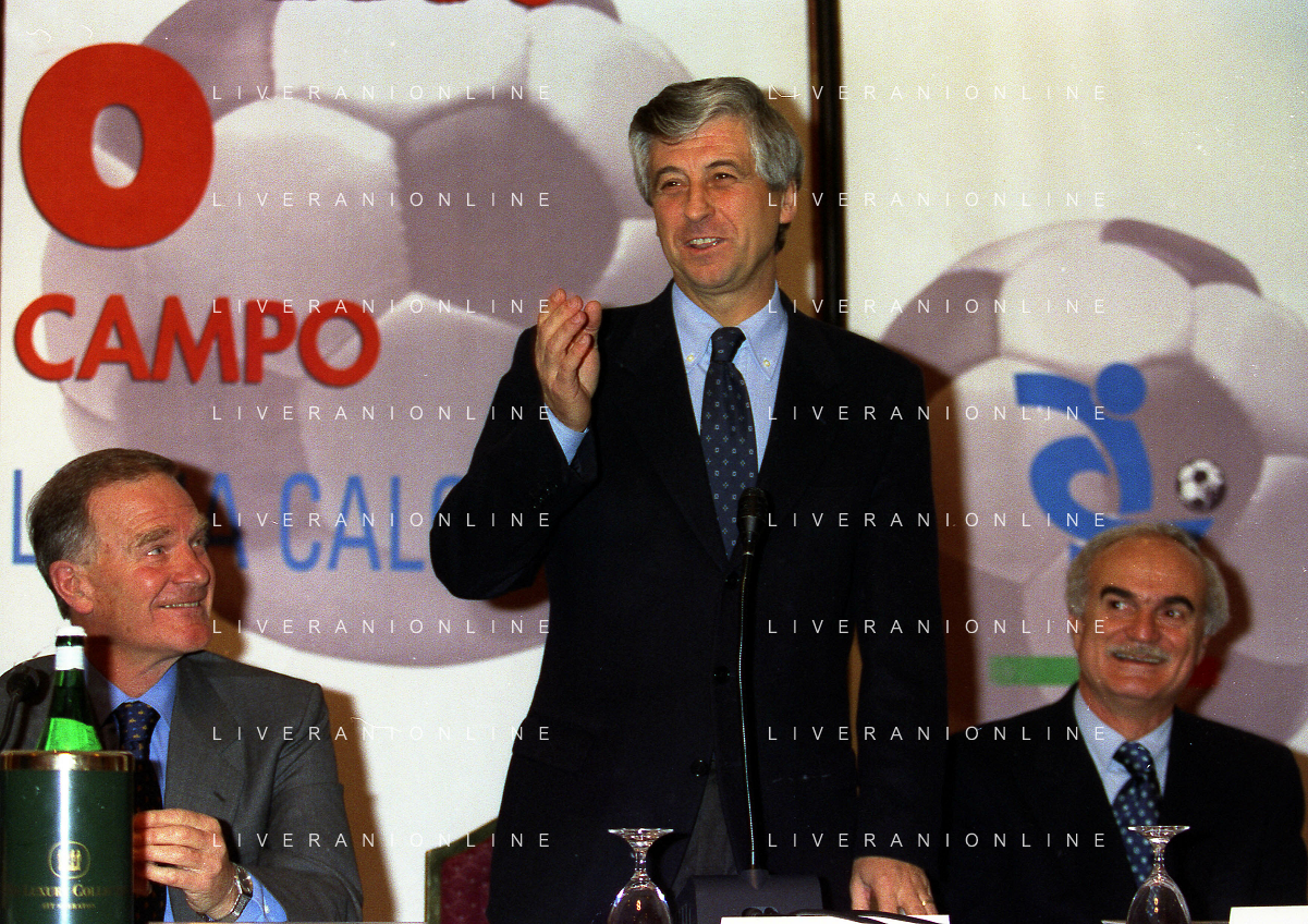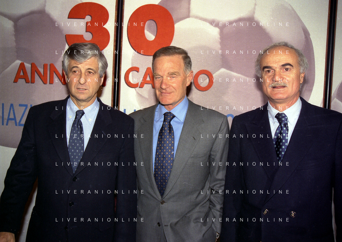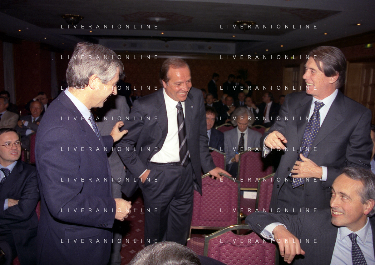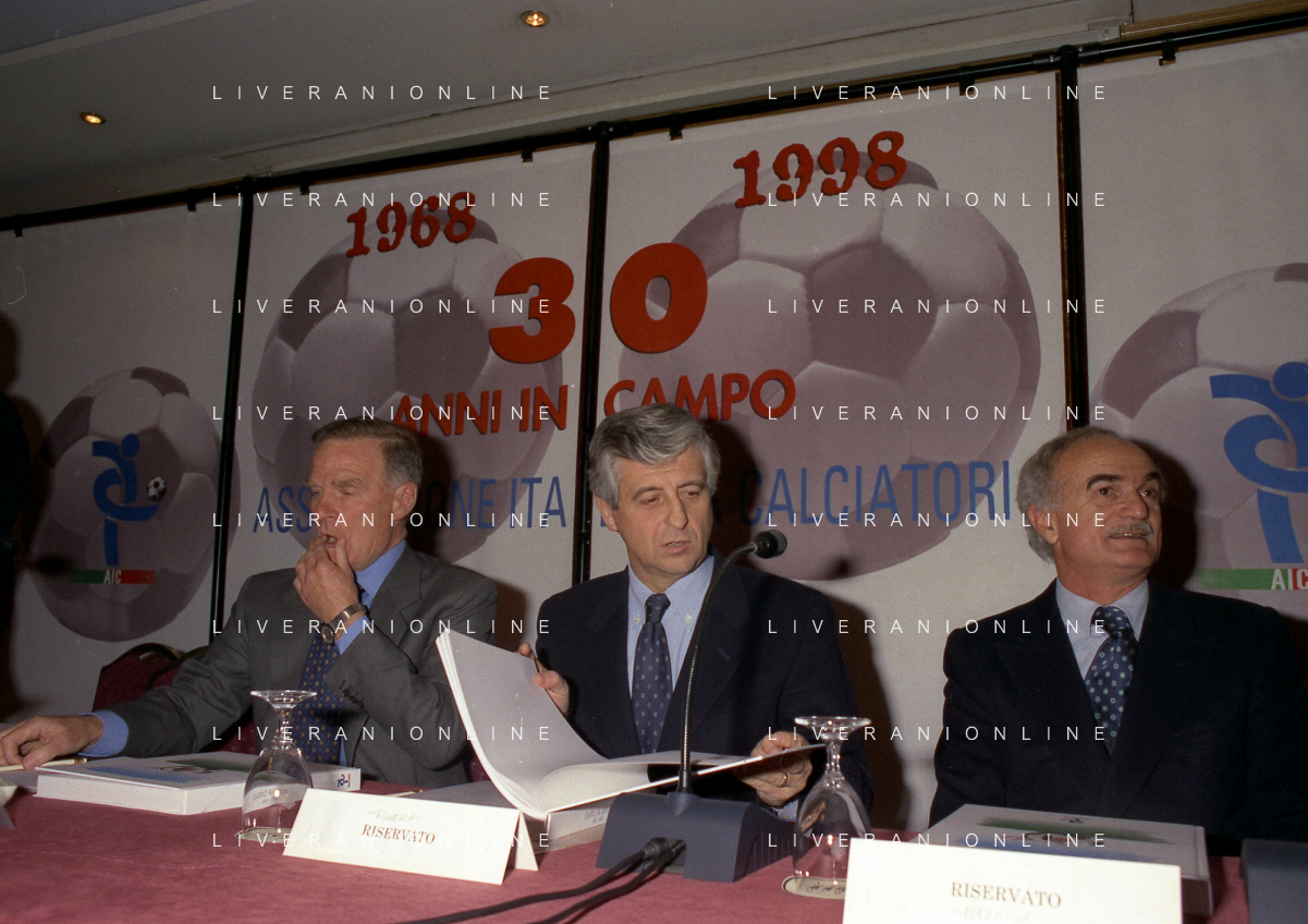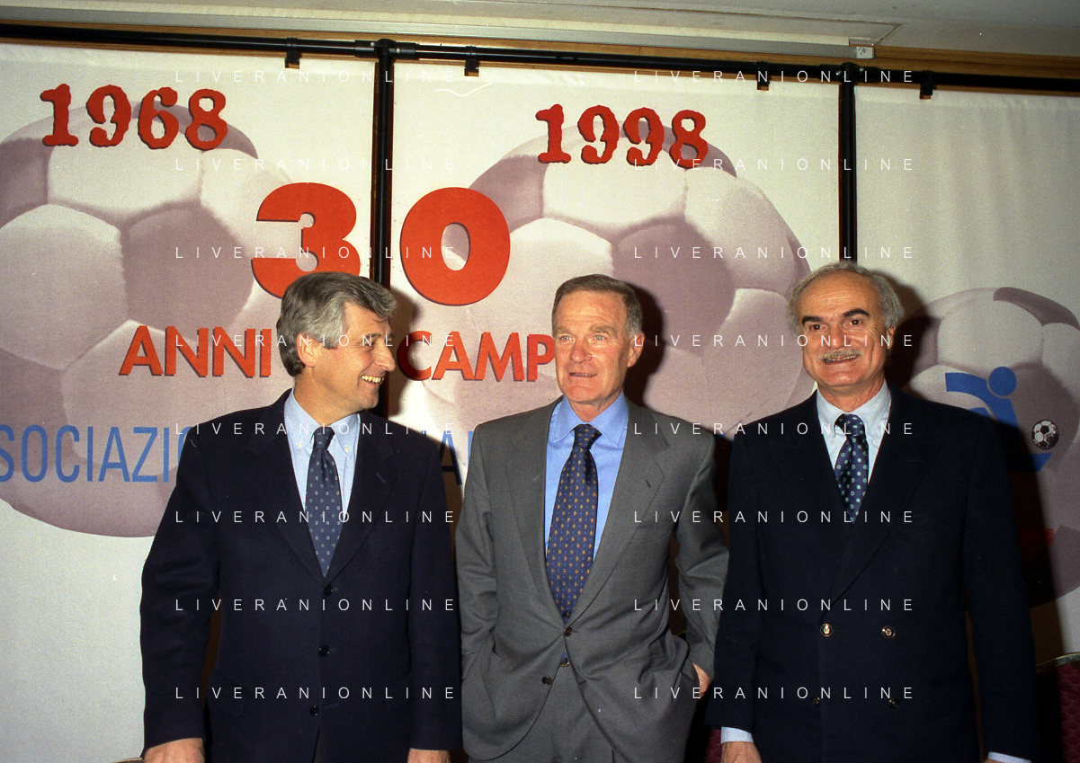 MILANO 14-12-1998 FESTA DI GALA DELL'ASSOCIAZIONE CALCIATORI PER I 30 ANNI DI ATTIVITA NELLA FOTO FRANCO CARRARO CON GIANNI RIVERA E LUCIANO NIZZOLA AG ALDO LIVERANI SAS