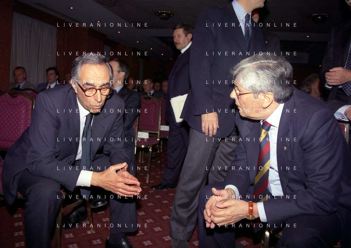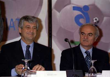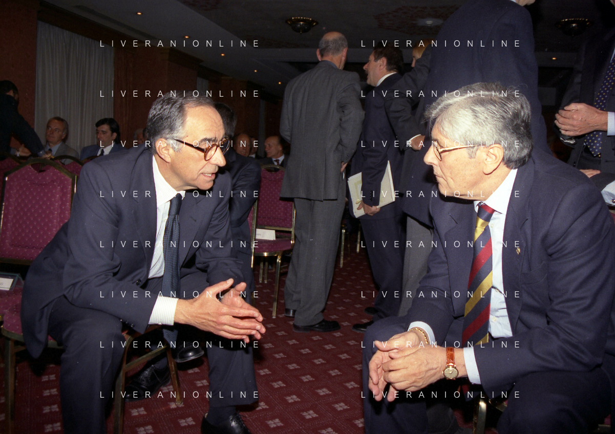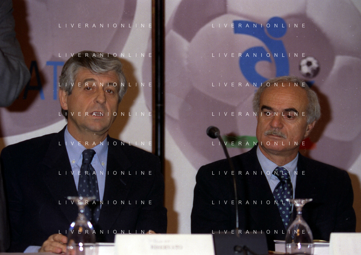 MILANO 14-12-1998 FESTA DI GALA DELL'ASSOCIAZIONE CALCIATORI PER I 30 ANNI DI ATTIVITA NELLA FOTO ADRIANO GALLIANI E FRANCO CARRARO AG ALDO LIVERANI SAS