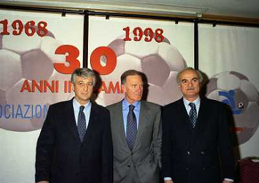 MILANO 14-12-1998 FESTA DI GALA DELL'ASSOCIAZIONE CALCIATORI PER I 30 ANNI DI ATTIVITA NELLA FOTO FRANCO DAL CIN CON GIANNI RIVERA E SANDRO MAZZOLA AG ALDO LIVERANI SAS