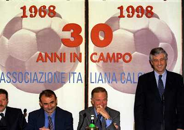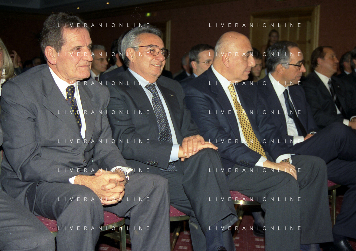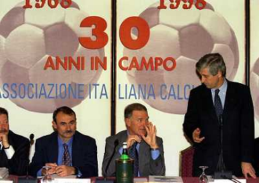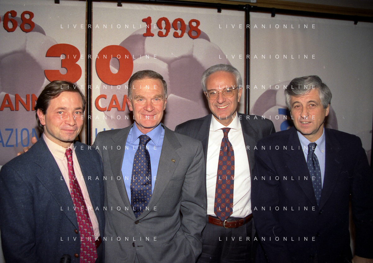 MILANO 14-12-1998 FESTA DI GALA DELL'ASSOCIAZIONE CALCIATORI PER I 30 ANNI DI ATTIVITA NELLA FOTO MARIO MACALLI-CANDIDO CANNAVO-ADRIANO GALLIANI E FRANCO CARRARO AG ALDO LIVERANI SAS
