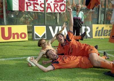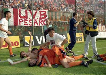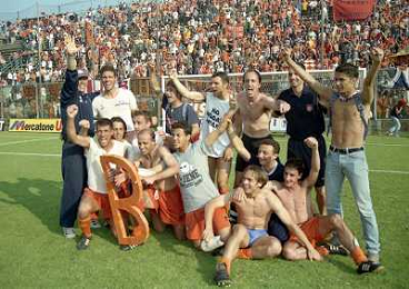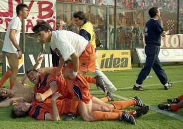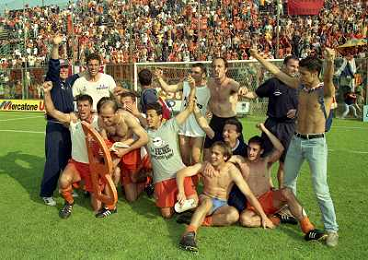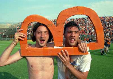 CREMONA 13-06-1999 FINALE PER LA PROMOZIONE IN SERIE B TRA PISTOIESE E LUMEZZANE NELLA FOTO GIOCATORI DELLA PISTOIESE ESULTANO A FINE GARA AG ALDO LIVERANI SAS