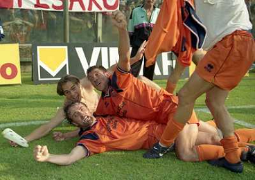 CREMONA 13-06-1999 FINALE PER LA PROMOZIONE IN SERIE B TRA PISTOIESE E LUMEZZANE NELLA FOTO ESULTANZA GIOCATORI PISTOIESE PER LA PROMOZIONE IN SERIE B AG ALDO LIVERANI SAS