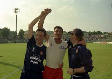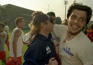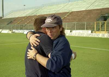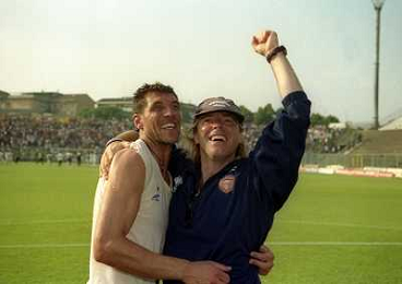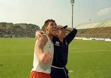 CREMONA 13-06-1999 FINALE PER LA PROMOZIONE IN SERIE B TRA PISTOIESE E LUMEZZANE NELLA FOTO ENIO BONALDI E ANDREA AGOSTINELLI A FINE GARA AG ALDO LIVERANI SAS