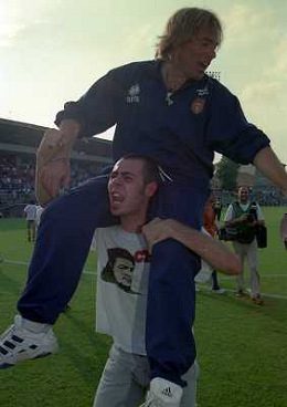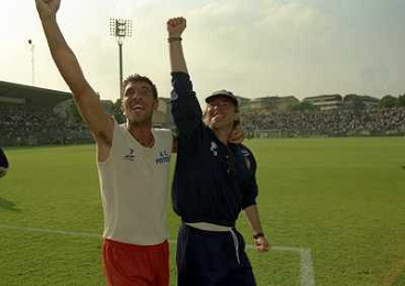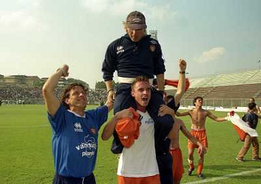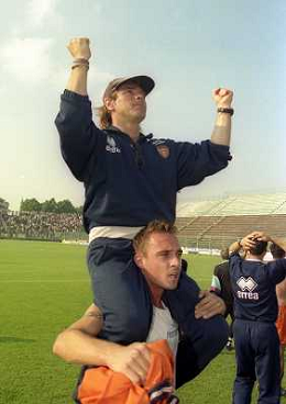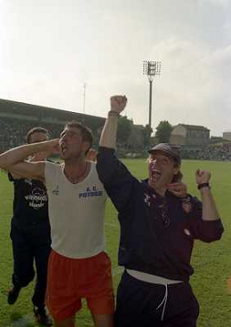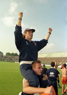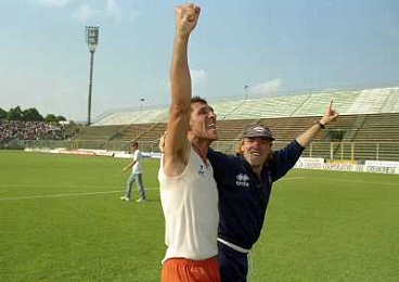 CREMONA 13-06-1999 FINALE PER LA PROMOZIONE IN SERIE B TRA PISTOIESE E LUMEZZANE NELLA FOTO ANDREA AGOSTINELLI ESULTA A FINE GARA AG ALDO LIVERANI SAS
