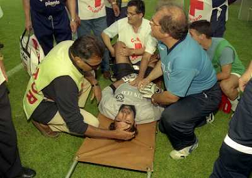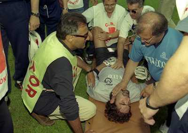 CREMONA 13-06-1999 FINALE PER LA PROMOZIONE IN SERIE B TRA PISTOIESE E LUMEZZANE NELLA FOTO INFORTUNIO PORTIERE LUMEZZANE AG ALDO LIVERANI SAS