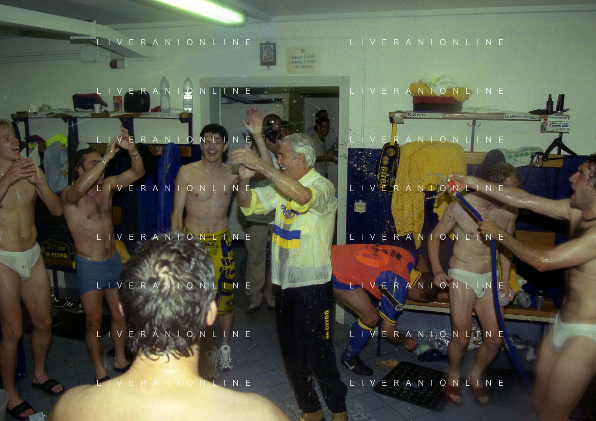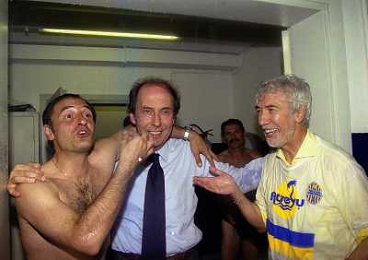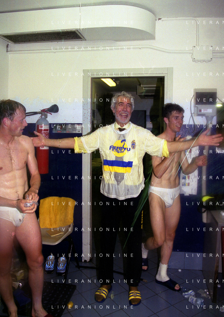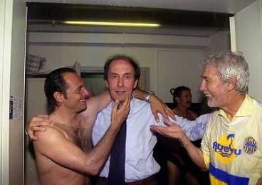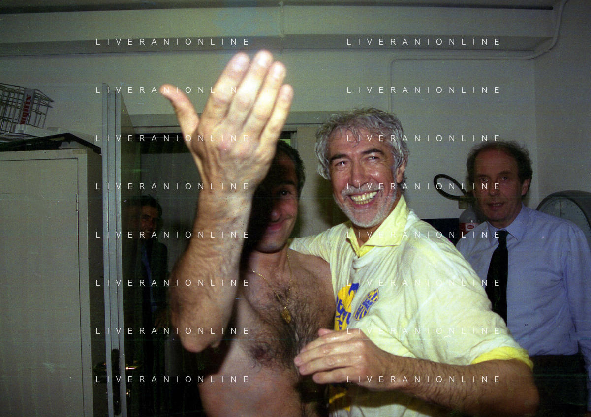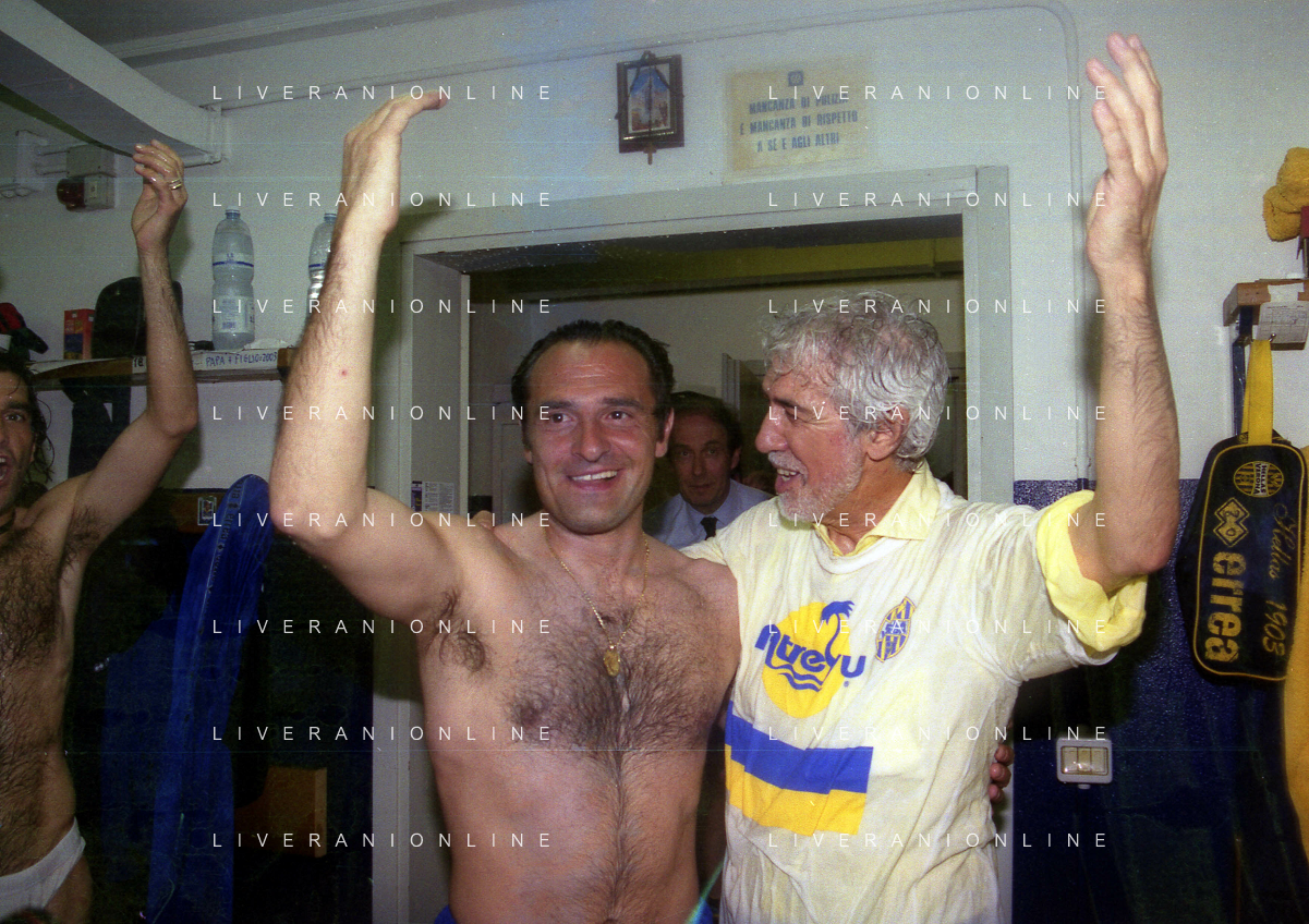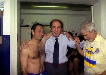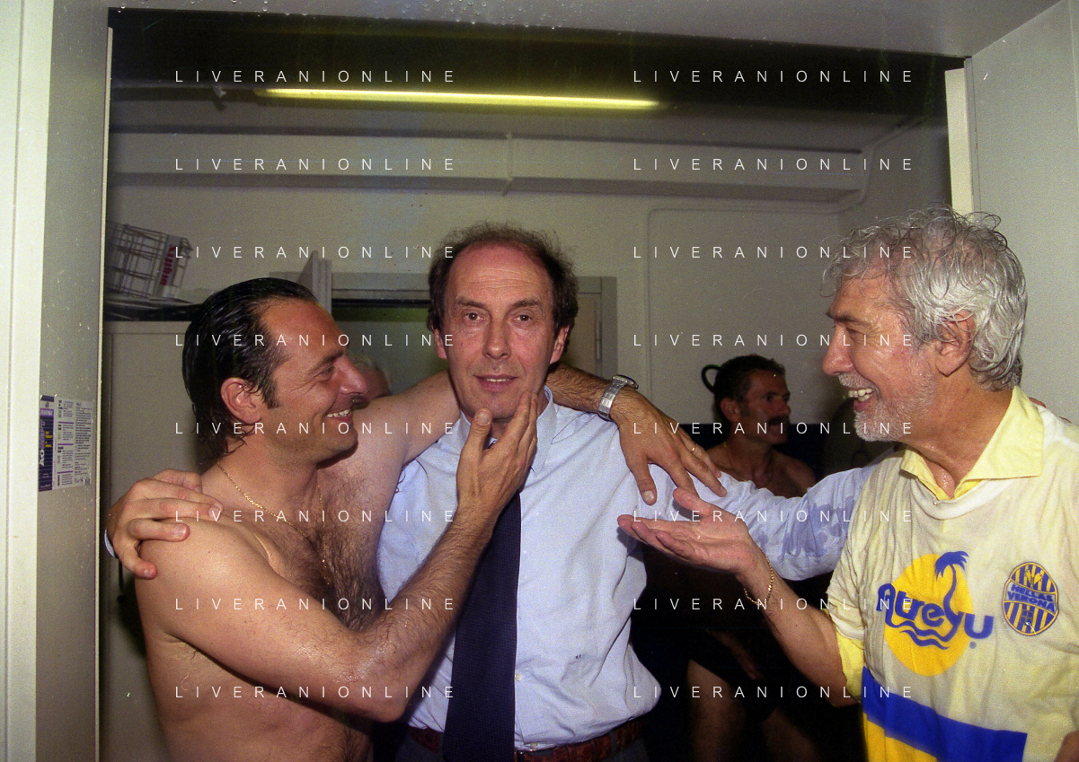 06-06-1999 CAMPIONATO DI CALCIO SERIE B VERONA -NAPOLI NELLA FOTO GIANBATTISTA PASTORELLO FESTEGGIA LA PROMOZIONE IN SERIE A CON CESARE PRANDELLI E RINO FOSCHI AG ALDO LIVERANI SAS