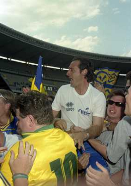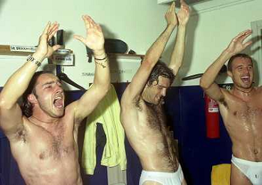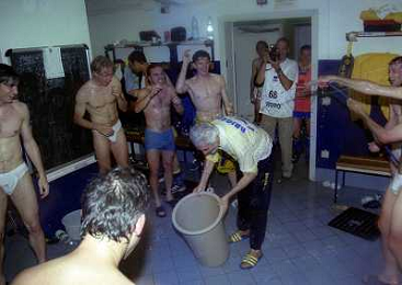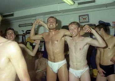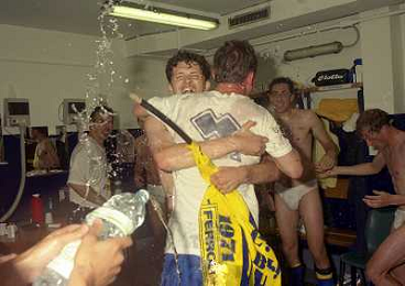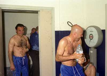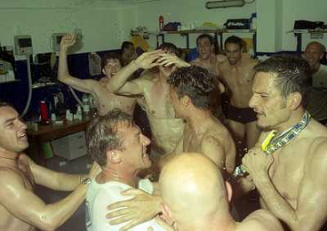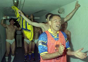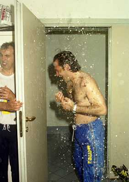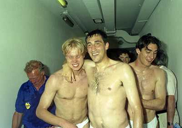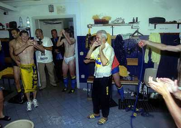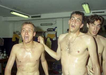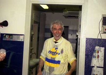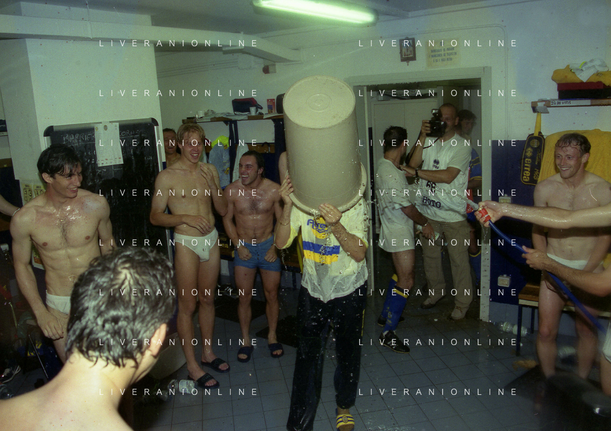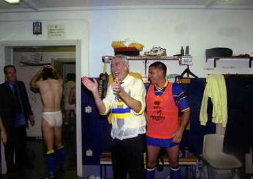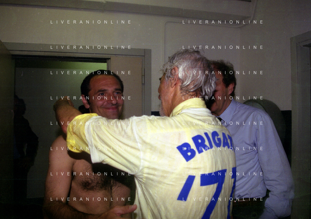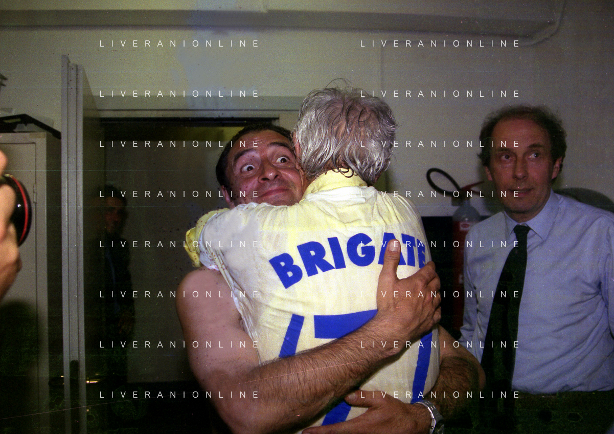 06-06-1999 CAMPIONATO DI CALCIO SERIE B VERONA -NAPOLI NELLA FOTO GIANBATTISTA PASTORELLO FESTEGGIA LA PROMOZIONE IN SERIE A CON CESARE PRANDELLI E RINO FOSCHI AG ALDO LIVERANI SAS