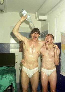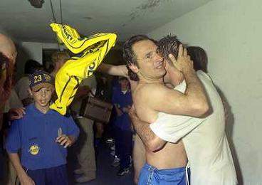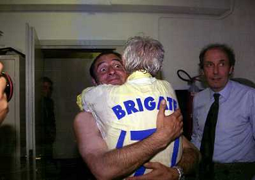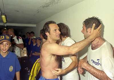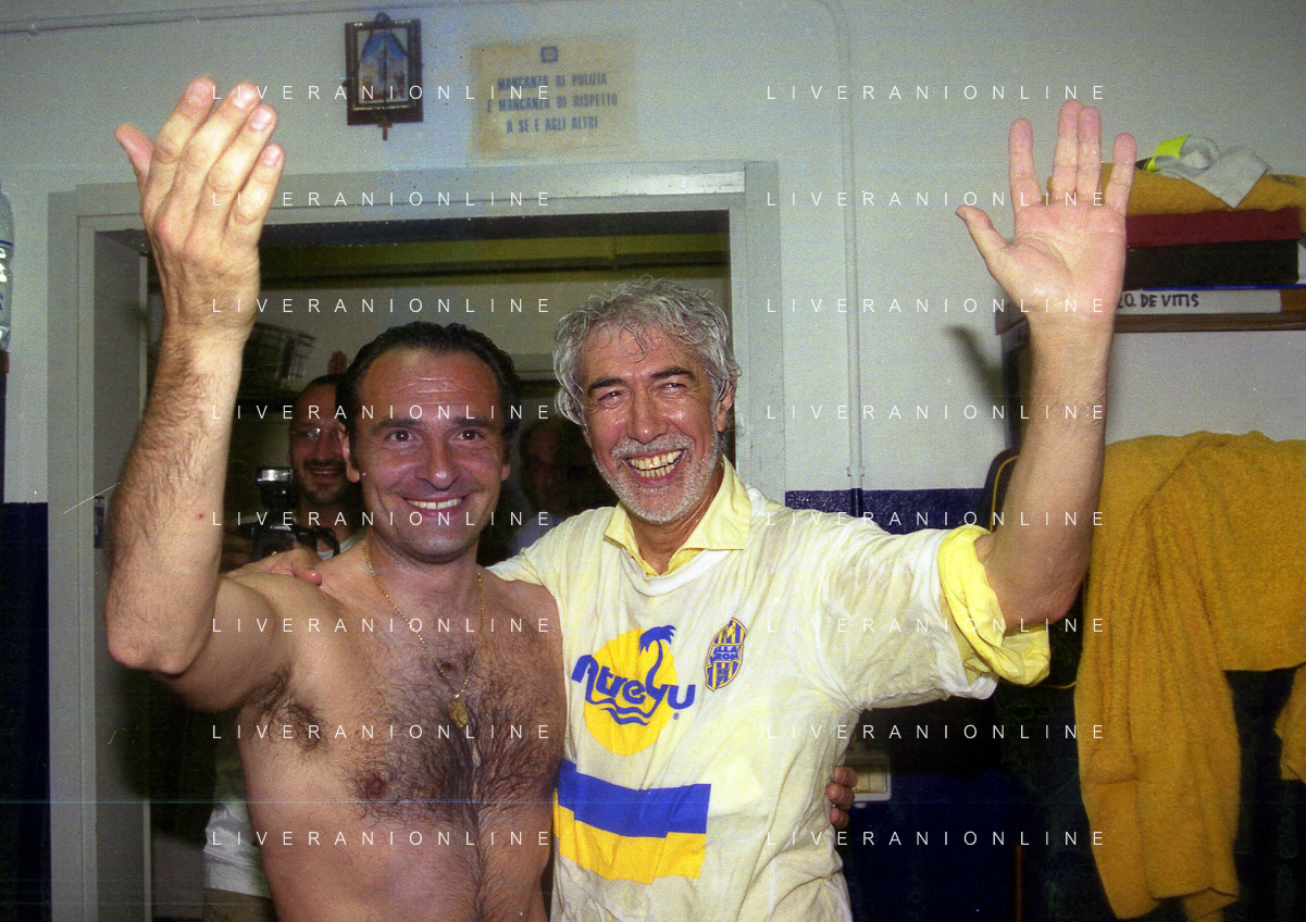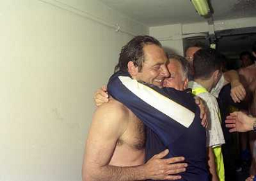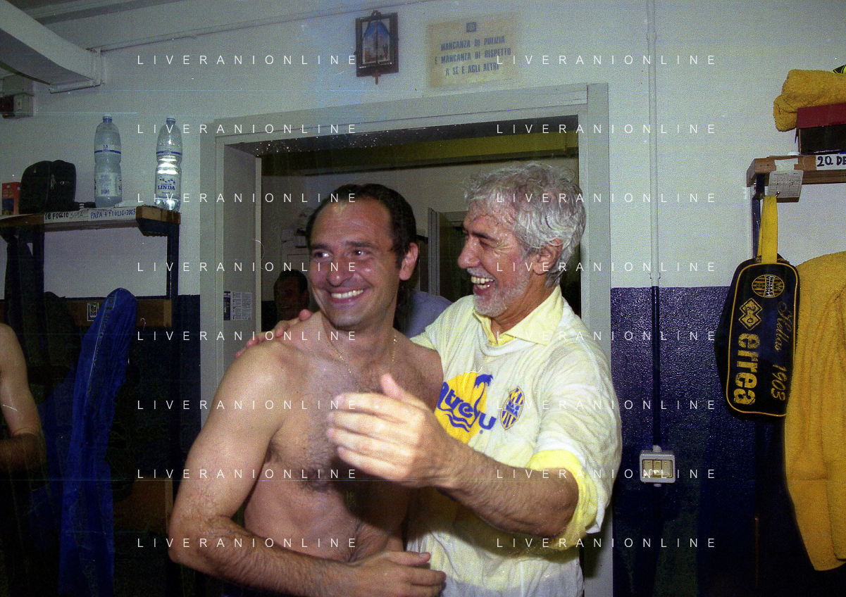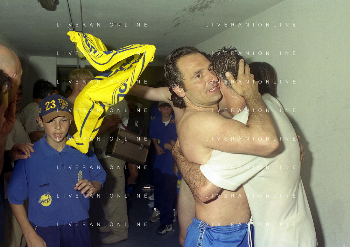 06-06-1999 CAMPIONATO DI CALCIO SERIE B VERONA -NAPOLI NELLA FOTO GIANBATTISTA PASTORELLO FESTEGGIA LA PROMOZIONE IN SERIE A CON CESARE PRANDELLI AG ALDO LIVERANI SAS