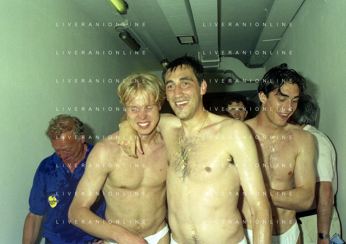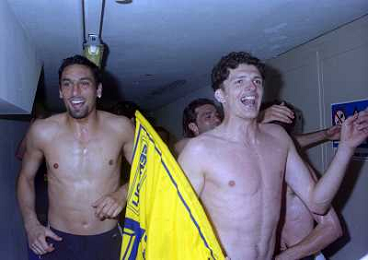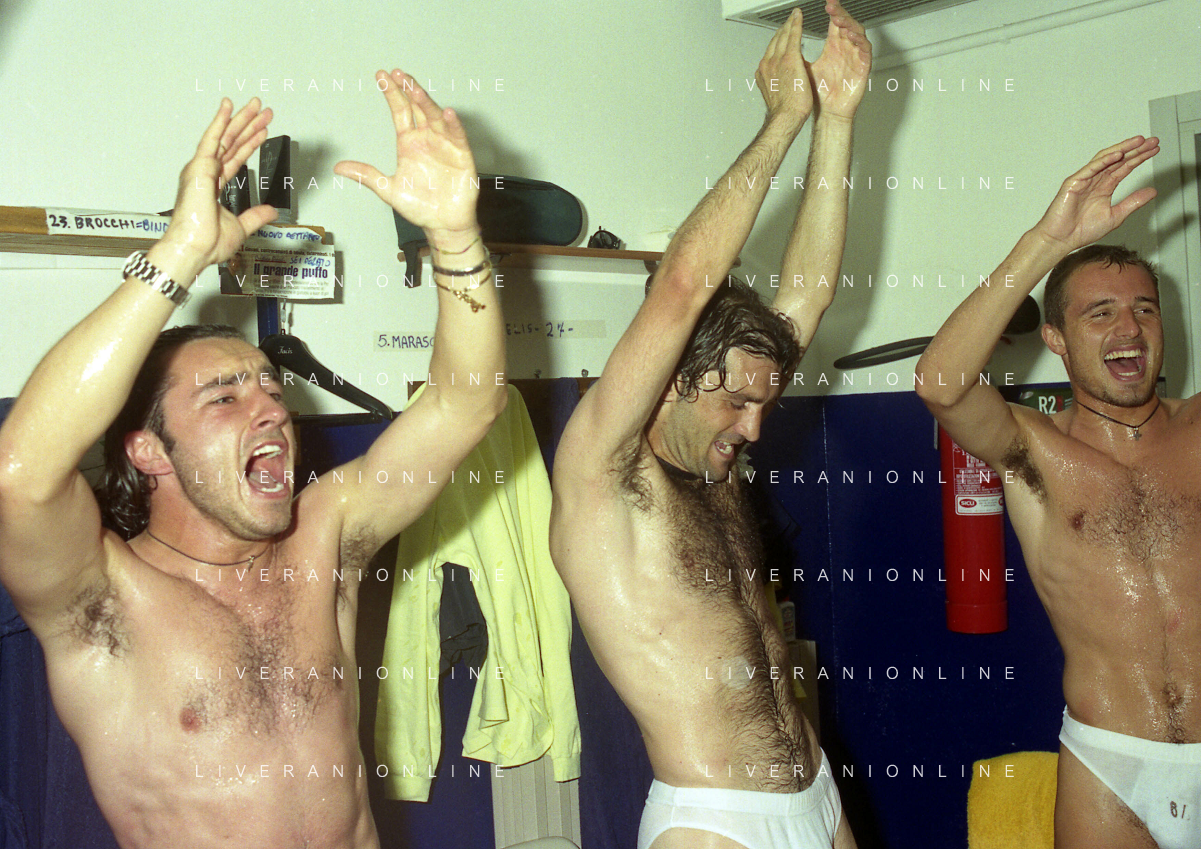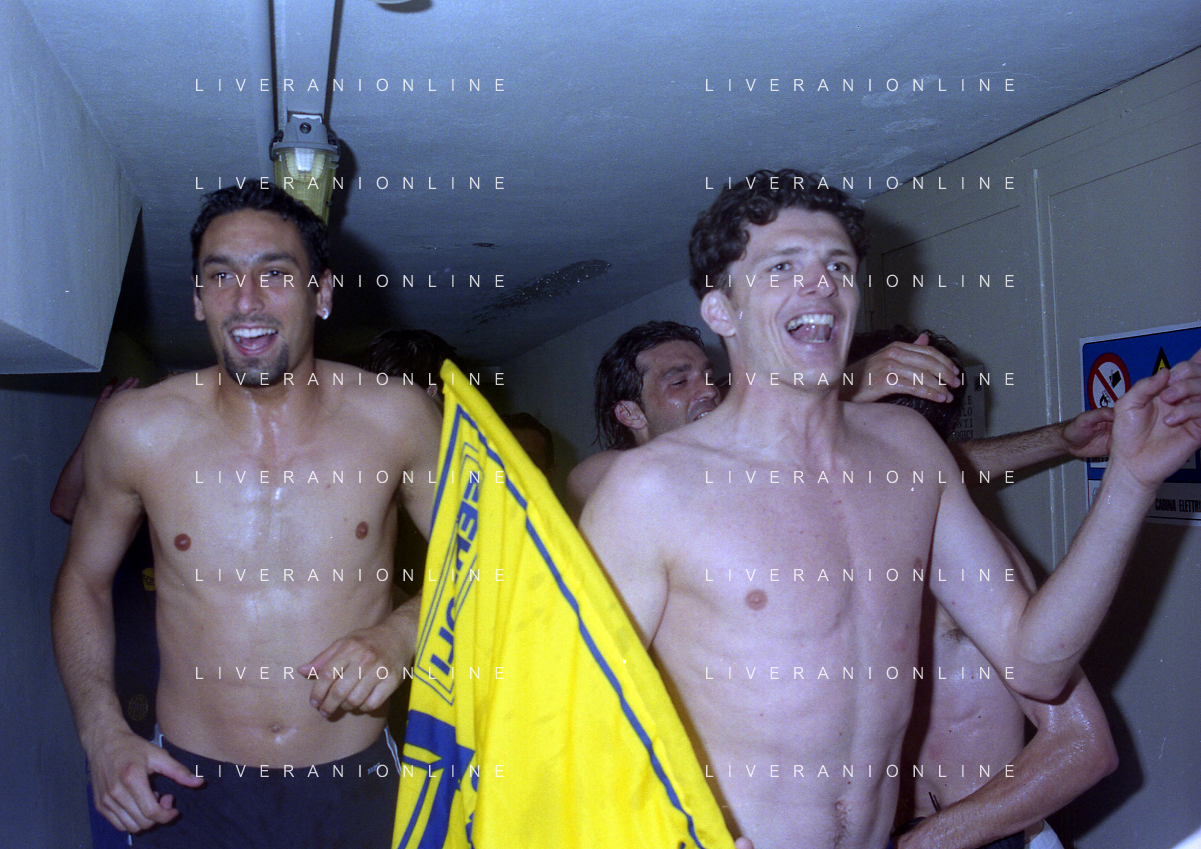 06-06-1999 CAMPIONATO DI CALCIO SERIE B VERONA -NAPOLI NELLA FOTO I GIOCATORI DEL VERONA FESTEGGIANO LA PROMOZIONE IN SERIE A PIETRO FANNA E CESARE PRANDELLI AG ALDO LIVERANI SAS